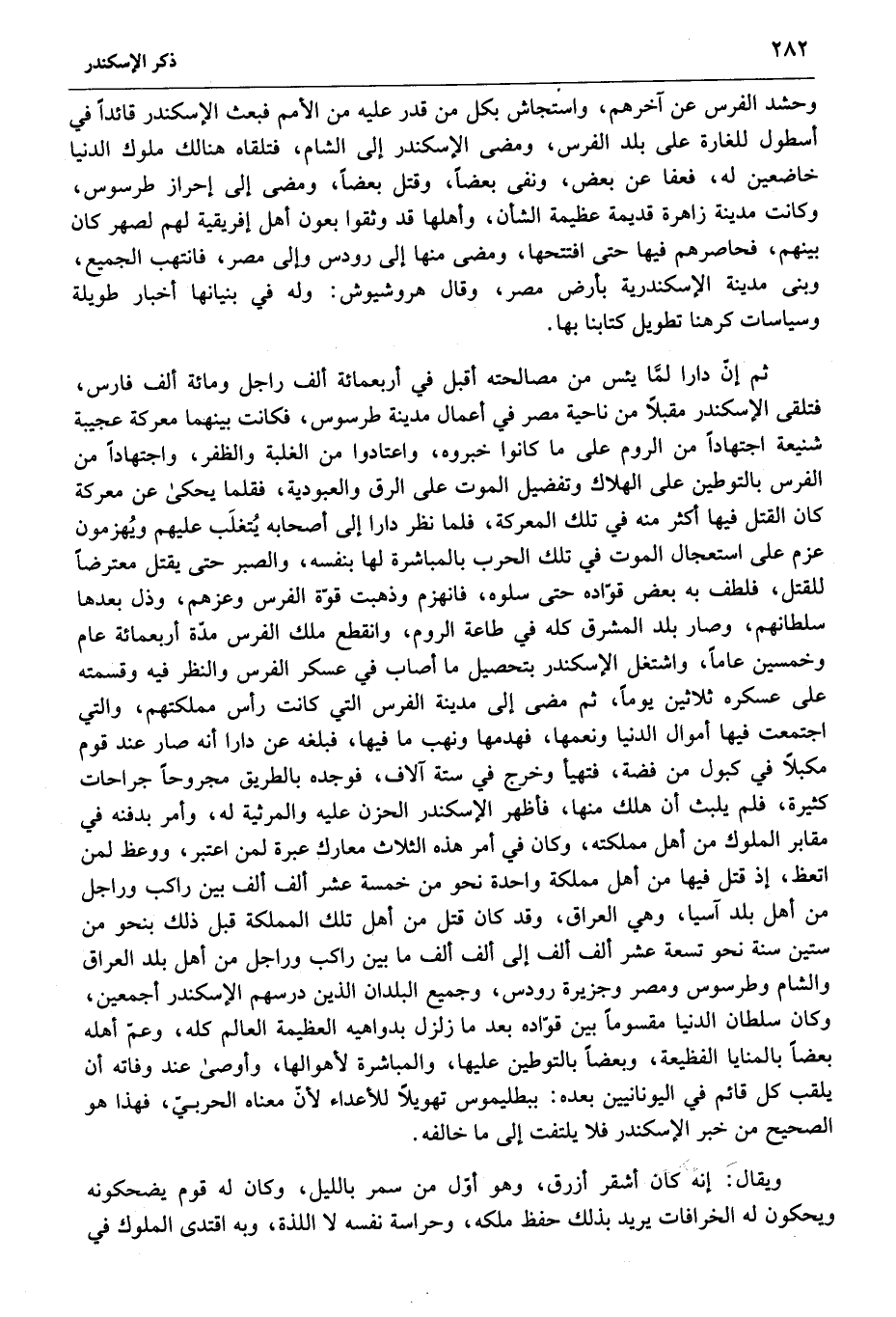 ثم إنّ دارا لمّا يئس من مصالحته أقبل في أربعمائة ألف راجل ومائة ألف فارس، فتلقى الإسكندر مقبلا من ناحية مصر في أعمال مدينة طرسوس، فكانت بينهما معركة عجيبة شنيعة اجتهادا من الروم على ما كانوا خبروه، واعتادوا من الغلبة والظفر، واجتهادا من الفرس بالتوطين على الهلاك وتفضيل الموت على الرق والعبودية، فقلما يحكى عن معركة كان القتل فيها أكثر منه في تلك المعركة، فلما نظر دارا إلى أصحابه يتغلب عليهم ويهزمون عزم على استعجال الموت في تلك الحرب بالمباشرة لها بنفسه، والصبر حتى يقتل معترضا للقتل، فلطف به بعض قوّاده حتى سلوه، فانهزم وذهبت قوّة الفرس وعزهم، وذل بعدها سلطانهم، وصار بلد المشرق كله في طاعة الروم، وانقطع ملك الفرس مدّة أربعمائة عام وخمسين عاما، واشتغل الإسكندر بتحصيل ما أصاب في عسكر الفرس والنظر فيه وقسمته على عسكره ثلاثين يوما، ثم مضى إلى مدينة الفرس التي كانت رأس مملكتهم، والتي اجتمعت فيها أموال الدنيا ونعمها، فهدمها ونهب ما فيها، فبلغه عن دارا أنه صار عند قوم مكبلا في كبول من فضة، فتهيأ وخرج في ستة آلاف، فوجده بالطريق مجروحا جراحات كثيرة، فلم يلبث أن هلك منها، فأظهر الإسكندر الحزن عليه والمرثية له، وأمر بدفنه في مقابر الملوك من أهل مملكته، وكان في أمر هذه الثلاث معارك عبرة لمن اعتبر، ووعظ لمن اتعظ، إذ قتل فيها من أهل مملكة واحدة نحو من خمسة عشر ألف ألف بين راكب وراجل من أهل بلد آسيا، وهي العراق، وقد كان قتل من أهل تلك المملكة قبل ذلك بنحو من ستين سنة نحو تسعة عشر ألف ألف إلى ألف ألف ما بين راكب وراجل من أهل بلد العراق والشام وطرسوس ومصر وجزيرة رودس، وجميع البلدان الذين درسهم الإسكندر أجمعين، وكان سلطان الدنيا مقسوما بين قوّاده بعد ما زلزل بدواهيه العظيمة العالم كله، وعمّ أهله بعضا بالمنايا الفظيعة، وبعضا بالتوطين عليها، والمباشرة لأهوالها، وأوصى عند وفاته أن يلقب كل قائم في اليونانيين بعده: ببطليموس تهويلا للأعداء لأنّ معناه الحربيّ، فهذا هو الصحيح من خبر الإسكندر فلا يلتفت إلى ما خالفه.