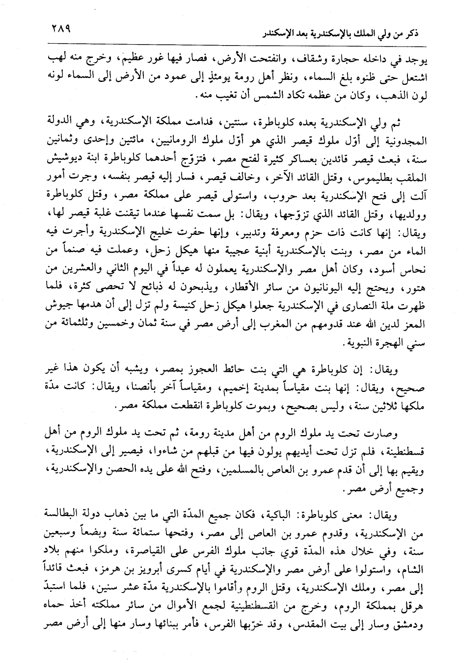 ويقال: معنى كلوباطرة: الباكية، فكان جميع المدّة التي ما بين ذهاب دولة البطالسة من الإسكندرية، وقدوم عمرو بن العاص إلى مصر، وفتحها ستمائة سنة وبعضا وسبعين سنة، وفي خلال هذه المدّة قوي جانب ملوك الفرس على القياصرة، وملكوا منهم بلاد الشام، واستولوا على أرض مصر والإسكندرية في أيام كسرى أبرويز بن هرمز، فبعث قائدا إلى مصر، وملك الإسكندرية، وقتل الروم وأقاموا بالإسكندرية مدّة عشر سنين، فلما استبدّ هرقل بمملكة الروم، وخرج من القسطنطينية لجمع الأموال من سائر مملكته أخذ حماه ودمشق وسار إلى بيت المقدس، وقد خرّبها الفرس، فأمر ببنائها وسار منها إلى أرض مصر