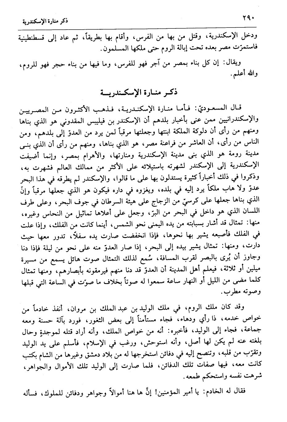 قال المسعوديّ: فأما منارة الإسكندرية، فذهب الأكثرون من المصريين والإسكندرانيين ممن عنى بأخبار بلدهم أن الإسكندر بن فيليبس المقدوني هو الذي بناها ومنهم من رأى أن دلوكة الملكة ابنتها وجعلتها مرقبا لمن يرد من العدوّ إلى بلدهم، ومن الناس من رأى، أن العاشر من فراعنة مصر، هو الذي بناها، ومنهم من رأى أن الذي بنى مدينة رومة هو الذي بنى مدينة الإسكندرية ومنارتها، والأهرام بمصر، وإنما أضيفت الإسكندرية إلى الإسكندر لشهرته باستيلائه على الأكثر من ممالك العالم فشهرت به، وذكروا في ذلك أخبارا كثيرة يستدلون بها على ما قالوا، والإسكندر لم يطرقه في هذا البحر عدوّ ولا هاب ملكا يرد إليه في بلده، ويغزوه في داره فيكون هو الذي جعلها مرقبا وإنّ الذي بناها جعلها على كرسيّ من الزجاج على هيئة السرطان في جوف البحر، وعلى طرف اللسان الذي هو داخل في البحر من البرّ، وجعل على أعلاها تماثيل من النحاس وغيره، منها: تمثال قد أشار بسبابته من يده اليمنى نحو الشمس، أينما كانت من الفلك، وإذا علت في الفلك فأصبعه يشير بها نحوها، فإذا انخفضت صارت يده سفلا، تدور معها حيث دارت، ومنها: تمثال يشير بيده إلى البحر، إذا صار العدوّ منه على نحو من ليلة فإذا دنا وجاوز أن يرى بالبصر لقرب المسافة، سمع لذلك التمثال صوت هائل يسمع من مسيرة ميلين أو ثلاثة، فيعلم أهل المدينة أن العدوّ قد دنا منهم فيرمقونه بأبصارهم، ومنها تمثال كلما مضى من الليل أو النهار ساعة سمعوا له صوتا بخلاف ما صوّت في الساعة التي قبلها وصوته مطرب.