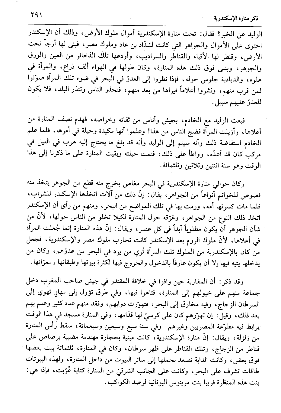 الوليد عن الخبر؟ فقال: تحت منارة الإسكندرية أموال ملوك الأرض، وذلك أن الإسكندر احتوى على الأموال والجواهر التي كانت لشدّاد بن عاد وملوك مصر، فبنى لها أزجا تحت الأرض، وقنطر لها الأقباء والقناطر والسراديب، وأودعها تلك الذخائر من العين والورق والجوهر، وبنى فوق ذلك هذه المنارة، وكان طولها في الهواء ألف ذراع، والمرآة في علوه، والدبادبة جلوس حوله، فإذا نظروا إلى العدوّ في البحر في ضوء تلك المرآة صوّتوا لمن قرب منهم، ونشروا أعلاما فيراها من بعد منهم، فتحذر الناس وتنذر البلد، فلا يكون للعدوّ عليهم سبيل.