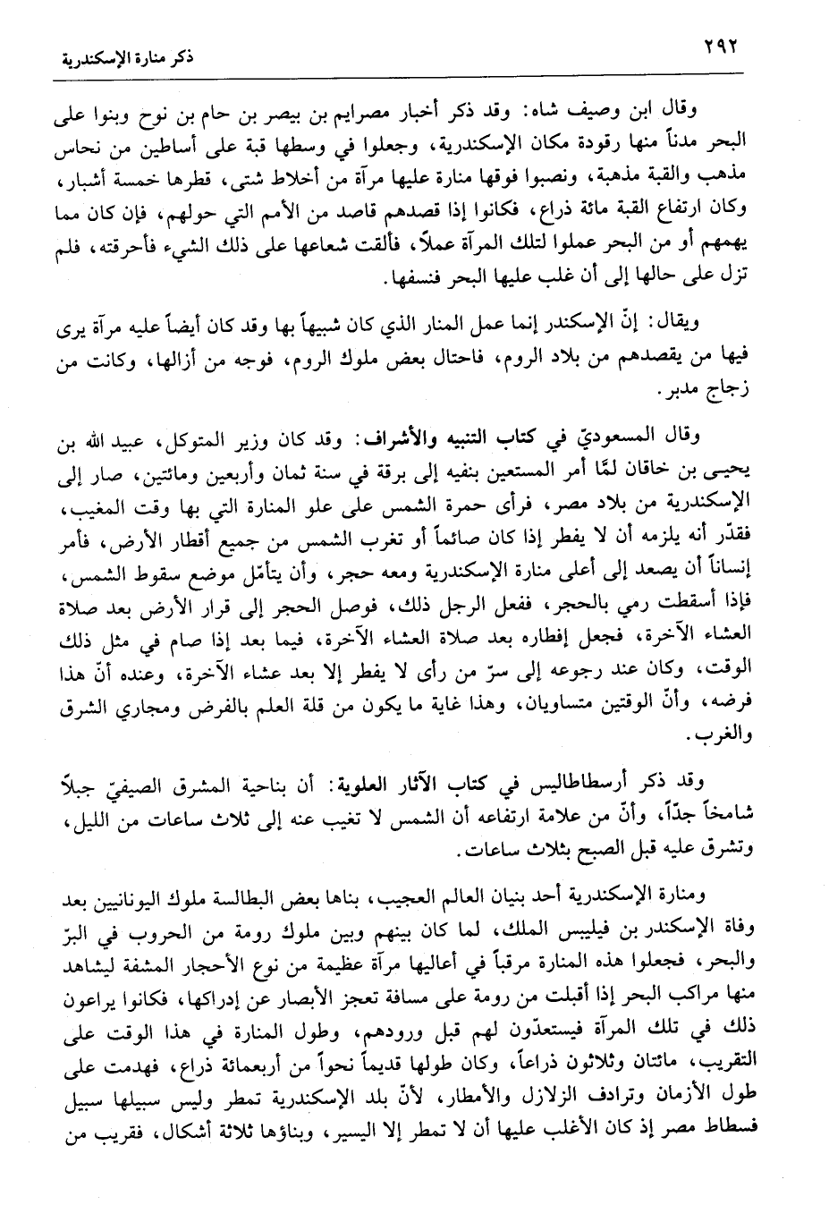 ومنارة الإسكندرية أحد بنيان العالم العجيب، بناها بعض البطالسة ملوك اليونانيين بعد وفاة الإسكندر بن فيليبس الملك، لما كان بينهم وبين ملوك رومة من الحروب في البرّ والبحر، فجعلوا هذه المنارة مرقبا في أعاليها مرآة عظيمة من نوع الأحجار المشفة ليشاهد منها مراكب البحر إذا أقبلت من رومة على مسافة تعجز الأبصار عن إدراكها، فكانوا يراعون ذلك في تلك المرآة فيستعدّون لهم قبل ورودهم، وطول المنارة في هذا الوقت على التقريب، مائتان وثلاثون ذراعا، وكان طولها قديما نحوا من أربعمائة ذراع، فهدمت على طول الأزمان وترادف الزلازل والأمطار، لأنّ بلد الإسكندرية تمطر وليس سبيلها سبيل فسطاط مصر إذ كان الأغلب عليها أن لا تمطر إلا اليسير، وبناؤها ثلاثة أشكال، فقريب من