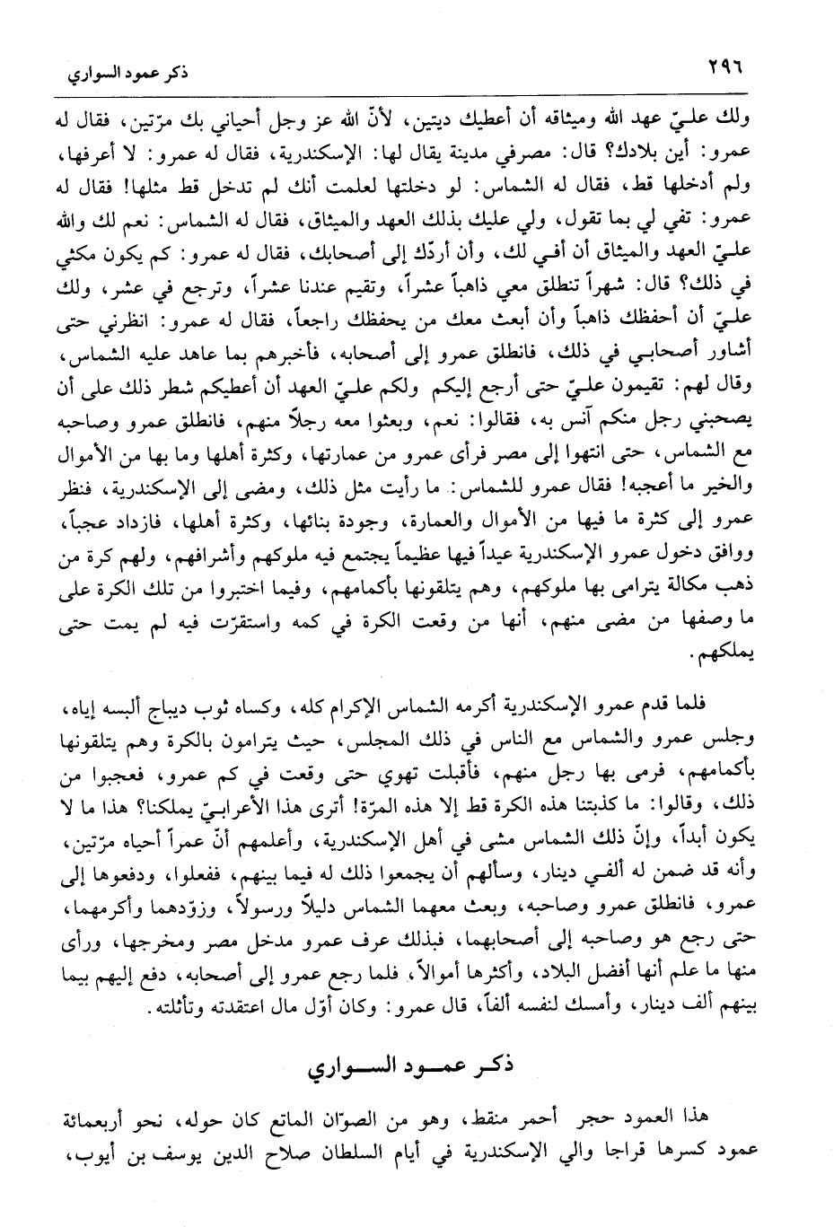 ولك عليّ عهد الله وميثاقه أن أعطيك ديتين، لأنّ الله عز وجل أحياني بك مرّتين، فقال له عمرو: أين بلادك؟ قال: مصر في مدينة يقال لها: الإسكندرية، فقال له عمرو: لا أعرفها، ولم أدخلها قط، فقال له الشماس: لو دخلتها لعلمت أنك لم تدخل قط مثلها! فقال له عمرو: تفي لي بما تقول، ولي عليك بذلك العهد والميثاق، فقال له الشماس: نعم لك والله عليّ العهد والميثاق أن أفي لك، وأن أردّك إلى أصحابك، فقال له عمرو: كم يكون مكثي في ذلك؟ قال: شهرا تنطلق معي ذاهبا عشرا، وتقيم عندنا عشرا، وترجع في عشر، ولك عليّ أن أحفظك ذاهبا وأن أبعث معك من يحفظك راجعا، فقال له عمرو: انظرني حتى أشاور أصحابي في ذلك، فانطلق عمرو إلى أصحابه، فأخبرهم بما عاهد عليه الشماس، وقال لهم: تقيمون عليّ حتى أرجع إليكم ولكم عليّ العهد أن أعطيكم شطر ذلك على أن يصحبني رجل منكم آنس به، فقالوا: نعم، وبعثوا معه رجلا منهم، فانطلق عمرو وصاحبه مع الشماس، حتى انتهوا إلى مصر فرأى عمرو من عمارتها، وكثرة أهلها وما بها من الأموال والخير ما أعجبه! فقال عمرو للشماس: ما رأيت مثل ذلك، ومضى إلى الإسكندرية، فنظر عمرو إلى كثرة ما فيها من الأموال والعمارة، وجودة بنائها، وكثرة أهلها، فازداد عجبا، ووافق دخول عمرو الإسكندرية عيدا فيها عظيما يجتمع فيه ملوكهم وأشرافهم، ولهم كرة من ذهب مكالة يترامى بها ملوكهم، وهم يتلقونها بأكمامهم، وفيما اختبروا من تلك الكرة على ما وصفها من مضى منهم، أنها من وقعت الكرة في كمه واستقرّت فيه لم يمت حتى يملكهم.