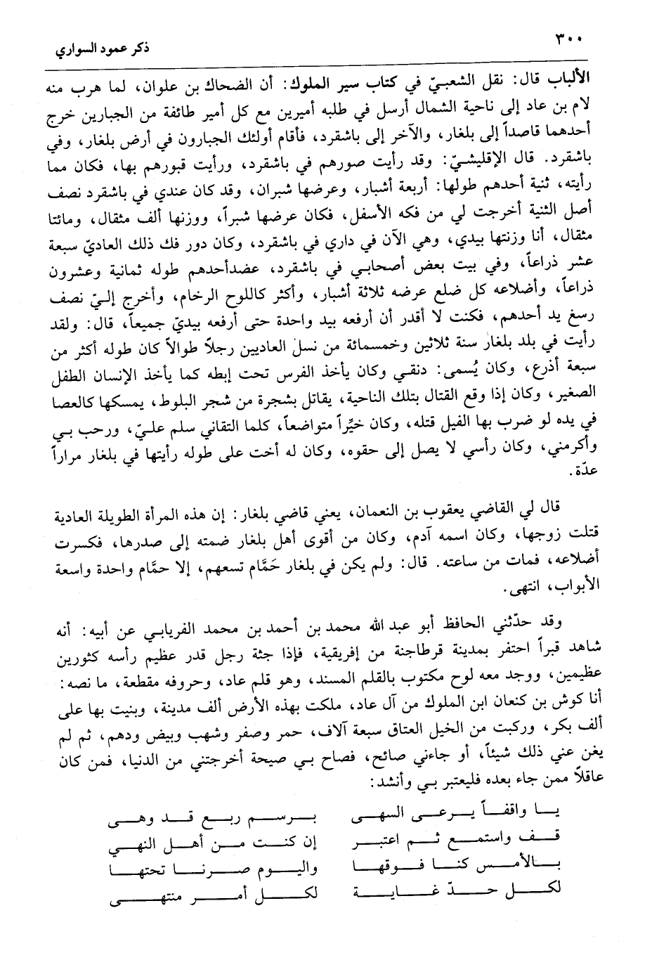 الألباب قال: نقل الشعبيّ في كتاب سير الملوك: أن الضحاك بن علوان، لما هرب منه لام بن عاد إلى ناحية الشمال أرسل في طلبه أميرين مع كل أمير طائفة من الجبارين خرج أحدهما قاصدا إلى بلغار، والآخر إلى باشقرد، فأقام أولئك الجبارون في أرض بلغار، وفي باشقرد. قال الإقليشيّ: وقد رأيت صورهم في باشقرد، ورأيت قبورهم بها، فكان مما رأيته، ثنية أحدهم طولها: أربعة أشبار، وعرضها شبران، وقد كان عندي في باشقرد نصف أصل الثنية أخرجت لي من فكه الأسفل، فكان عرضها شبرا، ووزنها ألف مثقال، ومائتا مثقال، أنا وزنتها بيدي، وهي الآن في داري في باشقرد، وكان دور فلك ذلك العاديّ سبعة عشر ذراعا، وفي بيت بعض أصحابي في باشقرد، عضد أحدهم طوله ثمانية وعشرون ذراعا، وأضلاعه كل ضلع عرضه ثلاثة أشبار، وأكثر كاللوح الرخام، وأخرج إليّ نصف رسغ يد أحدهم، فكنت لا أقدر أن أرفعه بيد واحدة حتى أرفعه بيديّ جميعا، قال: ولقد رأيت في بلد بلغار سنة ثلاثين وخمسمائة من نسل العاديين رجلا طوالا كان طوله أكثر من سبعة أذرع، وكان يسمى: دنقي وكان يأخذ الفرس تحت إبطه كما يأخذ الإنسان الطفل الصغير، وكان إذا وقع القتال بتلك الناحية، يقاتل بشجرة من شجر البلوط، يمسكها كالعصا في يده لو ضرب بها الفيل قتله، وكان خيّرا متواضعا، كلما التقاني سلم عليّ، ورحب بي وأكرمني، وكان رأسي لا يصل إلى حقوه، وكان له أخت على طوله رأيتها في بلغار مرارا عدّة.