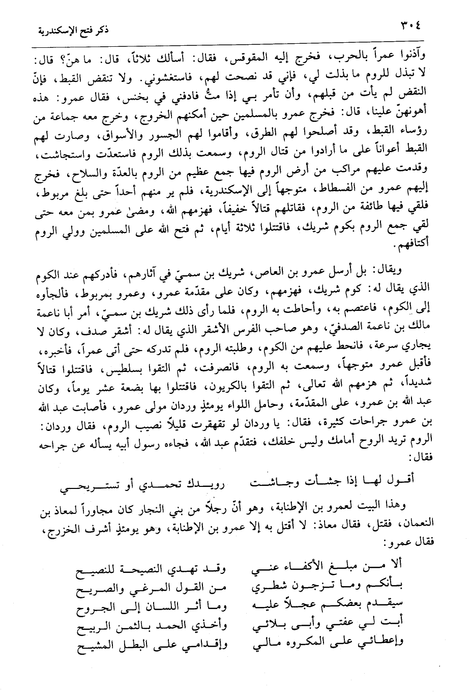 لا تبذل للروم ما بذلت لي، فإني قد نصحت لهم، فاستغشوني. ولا تنقض القبط، فإنّ النقض لم يأت من قبلهم، وأن تأمر بي إذا متّ فادفني في بخنس، فقال عمرو: هذه أهونهنّ علينا، قال: فخرج عمرو بالمسلمين حين أمكنهم الخروج، وخرج معه جماعة من رؤساء القبط، وقد أصلحوا لهم الطرق، وأقاموا لهم الجسور والأسواق، وصارت لهم القبط أعوانا على ما أرادوا من قتال الروم، وسمعت بذلك الروم فاستعدّت واستجاشت، وقدمت عليهم مراكب من أرض الروم فيها جمع عظيم من الروم بالعدّة والسلاح، فخرج إليهم عمرو من الفسطاط، متوجها إلى الإسكندرية، فلم ير منهم أحدا حتى بلغ مربوط، فلقي فيها طائفة من الروم، فقاتلهم قتالا خفيفا، فهزمهم الله، ومضى عمرو بمن معه حتى لقي جمع الروم بكوم شريك، فاقتتلوا ثلاثة أيام، ثم فتح الله على المسلمين وولي الروم أكتافهم.