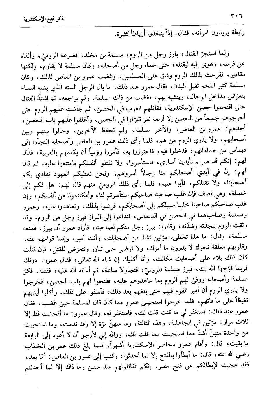 ولما استجرّ القتال، بارز رجل من الروم، مسلمة بن مخلد، فصرعه الروميّ، وألقاه عن فرسه، وهوى إليه ليقتله، حتى حماه رجل من أصحابه، وكان مسلمة لا يقاوم، ولكنها مقادير، ففرحت بذلك الروم وشق على المسلمين، وغضب عمرو بن العاص لذلك، وكان مسلمة كثير اللحم ثقيل البدن، فقال عمرو عند ذلك: ما بال الرجل السته الذي يشبه النساء يتعرّض مداخل الرجال، ويتشبه بهم، فغضب من ذلك مسلمة، ولم يراجعه، ثم اشتدّ القتال حتى اقتحموا حصن الإسكندرية، فقاتلهم العرب في الحصن، ثم جاشت عليهم الروم حتى أخرجوهم جميعا من الحصن إلا أربعة نفر تفرّقوا في الحصن، وأغلقوا عليهم باب الحصن، أحدهم: عمرو بن العاص، والآخر مسلمة، ولم نحفظ الآخرين، وحالوا بينهم وبين أصحابهم، ولا يدري الروم من هم، فلما رأى ذلك عمرو بن العاص وأصحابه التجأوا إلى ديماس من حماماتهم، فدخلوا فيه، فاحترزوا به، فأمروا روميا أن يكلمهم بالعربية، فقال لهم: إنكم قد صرتم بأيدينا أسارى، فاستأسروا، ولا تقتلوا أنفسكم فامتنعوا عليه، ثم قال لهم: إنّ في أيدي أصحابكم منا رجالا أسروهم، ونحن نعطيكم العهود نفادي بكم أصحابنا، ولا نقتلكم، فأبوا عليه، فلما رأى ذلك الروميّ منهم قال لهم: هل لكم إلى خصلة، وهي نصف فإن غلب صاحبنا صاحبكم استأسرتم لنا، وأمكنتمونا من أنفسكم، وإن غلب صاحبكم صاحبنا خلينا سبيلكم إلى أصحابكم، فرضوا بذلك، وتعاهدوا عليه، وعمرو ومسلمة وصاحباهما في الحصن في الديماس، فتداعوا إلى البراز فبرز رجل من الروم، وقد وثقت الروم بنجدته وشدّته، وقالوا: يبرز رجل منكم لصاحبنا، فأراد عمرو أن يبرز، فمنعه مسلمة، وقال: ما هذا تخطىء مرّتين تشذ من أصحابك، وأنت أمير، وإنما قوامهم بك، وقلوبهم معلقة نحوك لا يدرون ما أمرك، ولا ترضى حتى تبارز وتتعرّض للقتل، فإن قتلت كان ذلك بلاء على أصحابك مكانك، وأنا أكفيك إن شاء الله تعالى، فقال عمرو: دونك فربما فرّجها الله بك، فبرز مسلمة للروميّ، فتجاولا ساعة، ثم أعانه الله عليه، فقتله. فكرّ مسلمة وأصحابه ووفى لهم الروم بما عاهدوهم عليه، ففتحوا لهم باب الحصن، فخرجوا ولا يدري الروم أن أمير القوم فيهم حتى بلغهم بعد ذلك، فأسفوا على ذلك، وأكلوا أيديهم تغيظا على ما فاتهم، فلما خرجوا استحيى عمرو مما كان قال لمسلمة حين غضب، فقال عمرو عند ذلك: استغفر لي ما كنت قلت لك، فاستغفر له، وقال عمرو: ما أفحشت قط إلا ثلاث مرار: مرّتين في الجاهلية، وهذه الثالثة، وما منهنّ مرّة إلا وقد ندمت، وما استحييت من واحدة منهنّ أشدّ مما استحييت مما قلت لك، وو الله إني لأرجو أن لا أعود إلى الرابعة ما بقيت، قال: وأقام عمرو محاصر الإسكندرية أشهرا، فلما بلغ ذلك عمر بن الخطاب رضي الله عنه، قال: ما أبطأوا بالفتح إلا لما أحدثوا، وكتب إلى عمرو بن العاص: أمّا بعد، فقد عجبت لإبطائكم عن فتح مصر، إنكم تقاتلونهم منذ سنين وما ذاك إلا لما أحدثتم