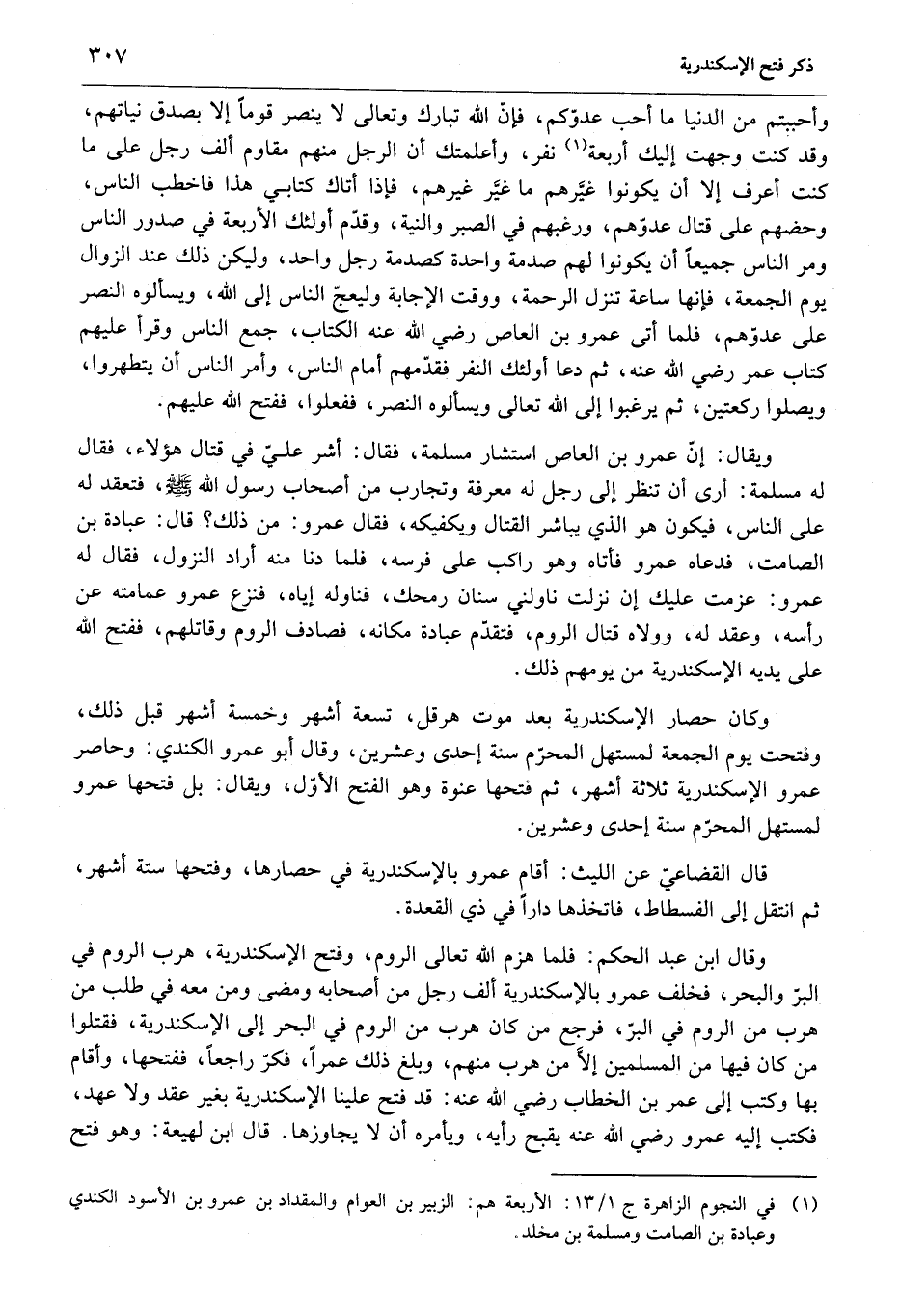 وأحببتم من الدنيا ما أحب عدوّكم، فإنّ الله تبارك وتعالى لا ينصر قوما إلا بصدق نياتهم، وقد كنت وجهت إليك أربعة «1» نفر، وأعلمتك أن الرجل منهم مقاوم ألف رجل على ما كنت أعرف إلا أن يكونوا غيّرهم ما غيّر غيرهم، فإذا أتاك كتابي هذا فاخطب الناس، وحضهم على قتال عدوّهم، ورغبهم في الصبر والنية، وقدّم أولئك الأربعة في صدور الناس ومر الناس جميعا أن يكونوا لهم صدمة واحدة كصدمة رجل واحد، وليكن ذلك عند الزوال يوم الجمعة، فإنها ساعة تنزل الرحمة، ووقت الإجابة وليعجّ الناس إلى الله، ويسألوه النصر على عدوّهم، فلما أتى عمرو بن العاص رضي الله عنه الكتاب، جمع الناس وقرأ عليهم كتاب عمر رضي الله عنه، ثم دعا أولئك النفر فقدّمهم أمام الناس، وأمر الناس أن يتطهروا، ويصلوا ركعتين، ثم يرغبوا إلى الله تعالى ويسألوه النصر، ففعلوا، ففتح الله عليهم.