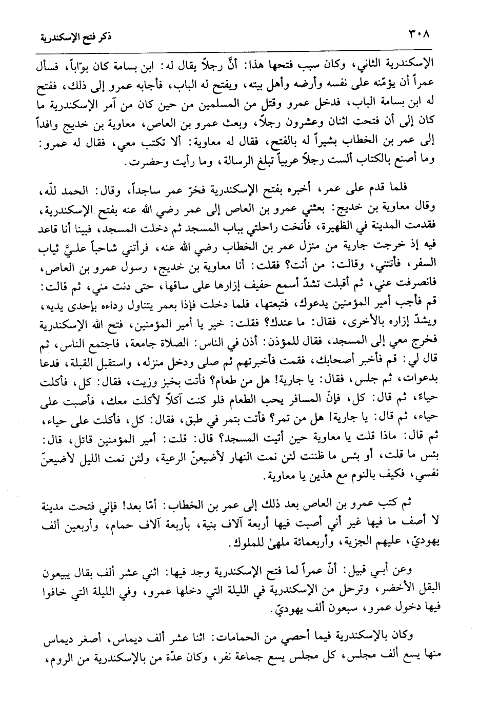 ثم كتب عمرو بن العاص بعد ذلك إلى عمر بن الخطاب: أمّا بعد! فإني فتحت مدينة لا أصف ما فيها غير أني أصبت فيها أربعة آلاف بنية، بأربعة آلاف حمام، وأربعين ألف يهوديّ، عليهم الجزية، وأربعمائة ملهى للملوك.