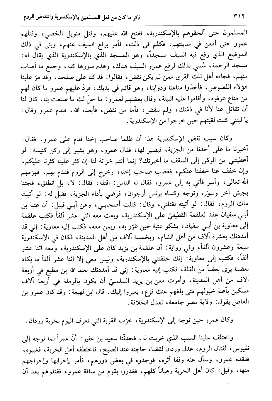 المسلمون حتى ألحقوهم بالإسكندرية، ففتح الله عليهم، وقتل منويل الخصي، وقتلهم عمرو حتى أمعن في مدينتهم، فكلم في ذلك، فأمر برفع السيف عنهم، وبنى في ذلك الموضع الذي رفع فيه السيف مسجدا، وهو المسجد الذي بالإسكندرية الذي يقال له: