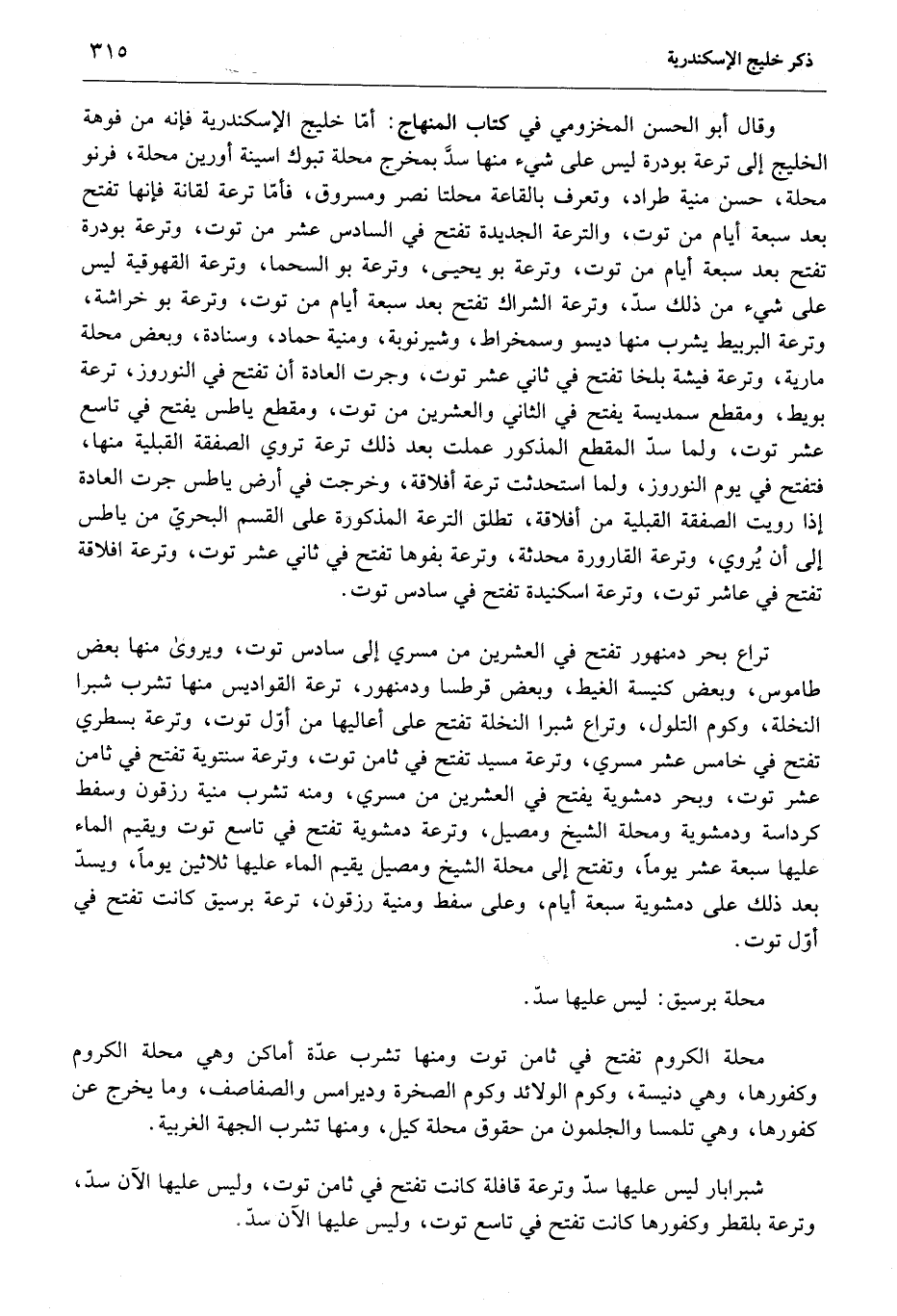 وقال أبو الحسن المخزومي في كتاب المنهاج: أمّا خليج الإسكندرية فإنه من فوهة الخليج إلى ترعة بودرة ليس على شيء منها سدّ بمخرج محلة تبوك اسينة أورين محلة، فرنو محلة، حسن منية طراد، وتعرف بالقاعة محلتا نصر ومسروق، فأمّا ترعة لقانة فإنها تفتح بعد سبعة أيام من توت، والترعة الجديدة تفتح في السادس عشر من توت، وترعة بودرة تفتح بعد سبعة أيام من توت، وترعة بو يحيى، وترعة بو السحما، وترعة القهوقية ليس على شيء من ذلك سدّ، وترعة الشراك تفتح بعد سبعة أيام من توت، وترعة بو خراشة، وترعة البربيط يشرب منها ديسو وسمخراط، وشيرنوبة، ومنية حماد، وسنادة، وبعض محلة مارية، وترعة فيشة بلخا تفتح في ثاني عشر توت، وجرت العادة أن تفتح في النوروز، ترعة بويط، ومقطع سمديسة يفتح في الثاني والعشرين من توت، ومقطع ياطس يفتح في تاسع عشر توت، ولما سدّ المقطع المذكور عملت بعد ذلك ترعة تروي الصفقة القبلية منها، فتفتح في يوم النوروز، ولما استحدثت ترعة أفلاقة، وخرجت في أرض ياطس جرت العادة إذا رويت الصفقة القبلية من أفلاقة، تطلق الترعة المذكورة على القسم البحريّ من ياطس إلى أن يروي، وترعة القارورة محدثة، وترعة بفوها تفتح في ثاني عشر توت، وترعة افلاقة تفتح في عاشر توت، وترعة اسكنيدة تفتح في سادس توت.