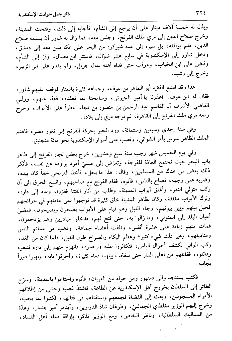 وفي يوم الخميس شهر رجب سنة سبع وعشرين، خرج بعض تجار الفرنج إلى ظاهر باب البحر حيث تجتمع العامّة للفرجة، وتعرّض إلى صبيّ أمرد يراوده عن نفسه، فأنكر ذلك بعض من هناك من المسلمين، وقال: هذا ما يحل، فأخذ الفرنجي خفا كان بيده، وضربه على وجهه، فصاح بالناس، فأتوه، فقام الفرنج مع صاحبهم، واتسع الخرق إلى أن ركب متولي الثغر، وأغلق أبواب المدينة، وطلب من أثار الفتنة ففرّوا، وعاد إلى داره، وترك الأبواب مغلقة، وكان بظاهر المدينة خلق كثيرة قد توجهوا على عادتهم في حوائجهم فحيل بينهم وبين بيوتهم، وجاء الليل وهم قيام على الأبواب يضجون ويصيحون، فمضى أعيان البلد إلى المتولي، وما زالوا به، حتى فتح لهم، فدخلوا مبادرين وهم يزدحمون، فمات منهم زيادة على عشرة أنفس، وتلفت أعضاء جماعة، وذهب من عمائم الناس ومناديلهم، وغير ذلك شيء كثير؛ وعظم البكاء والصراخ طول الليل، فلما كان من الغد، ركب الوالي لكشف أحوال الناس، فتكاثروا عليه ورجموه، فانهزم منهم إلى داره فتبعوه وقاتلوه، فقاتلهم من أعلى الدار حتى سفكت بينهما دماء كثيرة، وأحرقوا بابه، ونهبوا دورا بجانبه.