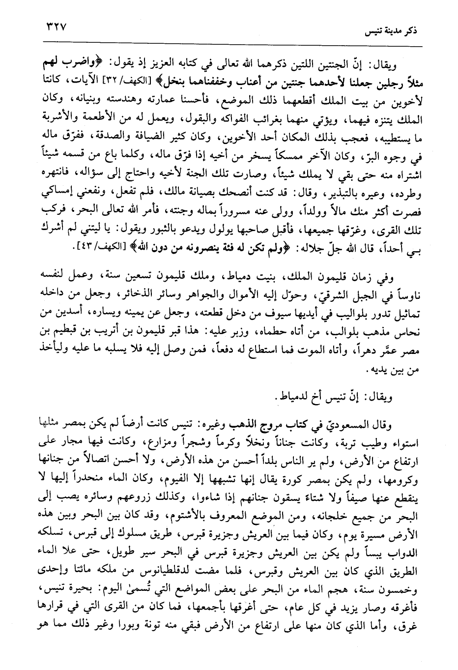 وقال المسعوديّ في كتاب مروج الذهب وغيره: تنيس كانت أرضا لم يكن بمصر مثلها استواء وطيب تربة، وكانت جنانا ونخلا وكرما وشجرا ومزارع، وكانت فيها مجار على ارتفاع من الأرض، ولم ير الناس بلدا أحسن من هذه الأرض، ولا أحسن اتصالا من جنانها وكرومها، ولم يكن بمصر كورة يقال إنها تشبهها إلا الفيوم، وكان الماء منحدرا إليها لا ينقطع عنها صيفا ولا شتاء يسقون جنانهم إذا شاءوا، وكذلك زروعهم وسائره يصب إلى البحر من جميع خلجانه، ومن الموضع المعروف بالأشتوم، وقد كان بين البحر وبين هذه الأرض مسيرة يوم، وكان فيما بين العريش وجزيرة قبرس، طريق مسلوك إلى قبرس، تسلكه الدواب يبسا ولم يكن بين العريش وجزيرة قبرس في البحر سير طويل، حتى علا الماء الطريق الذي كان بين العريش وقبرس، فلما مضت لدقلطيانوس من ملكه مائتا وإحدى وخمسون سنة، هجم الماء من البحر على بعض المواضع التي تسمى اليوم: بحيرة تنيس، فأغرقه وصار يزيد في كل عام، حتى أغرقها بأجمعها، فما كان من القرى التي في قرارها غرق، وأما الذي كان منها على ارتفاع من الأرض فبقي منه تونة وبورا وغير ذلك مما هو