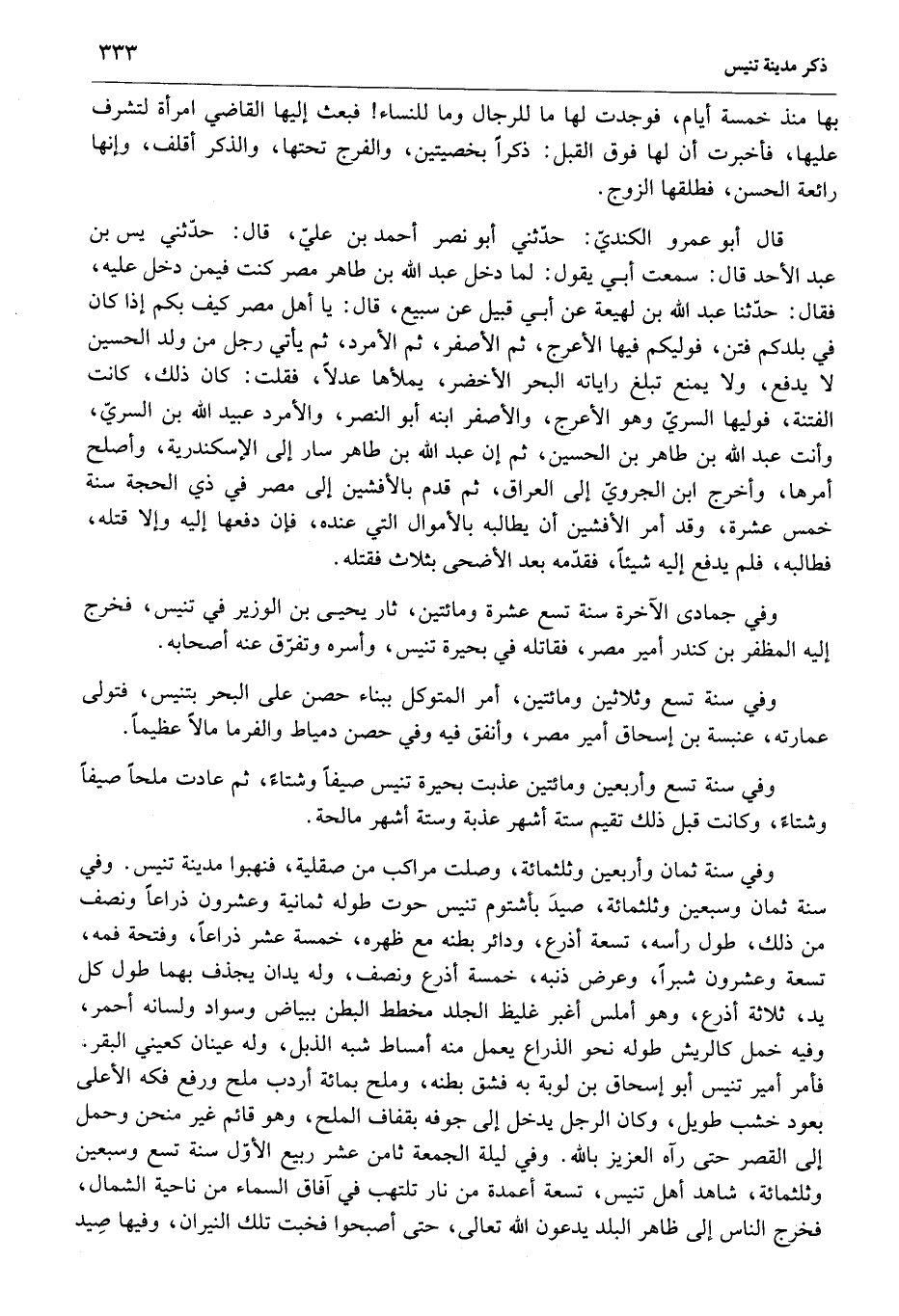 وفي سنة ثمان وأربعين وثلثمائة، وصلت مراكب من صقلية، فنهبوا مدينة تنيس. وفي سنة ثمان وسبعين وثلثمائة، صيد بأشتوم تنيس حوت طوله ثمانية وعشرون ذراعا ونصف من ذلك، طول رأسه، تسعة أذرع، ودائر بطنه مع ظهره، خمسة عشر ذراعا، وفتحة فمه، تسعة وعشرون شبرا، وعرض ذنبه، خمسة أذرع ونصف، وله يدان يجذف بهما طول كل يد، ثلاثة أذرع، وهو أملس أغبر غليظ الجلد مخطط البطن ببياض وسواد ولسانه أحمر، وفيه خمل كالريش طوله نحو الذراع يعمل منه أمساط شبه الذبل، وله عينان كعيني البقر.