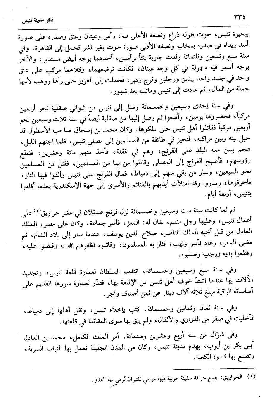 ببحيرة تنيس، حوت طوله ذراع ونصفه الأعلى فيه، رأس وعينان وعنق وصدره على صورة أسد ويداه في صدره بمخالبه ونصفه الأدنى صورة حوت بغير قشر فحمل إلى القاهرة. وفي سنة سبع وتسعين وثلثمائة ولدت جارية بنتا برأسين، أحدهما بوجه أبيض مستدير، والآخر بوجه أسمر فيه سهولة في كل وجه عينان، فكانت ترضعهما، وكلاهما مركب على عنق واحد في جسد واحد بيدين ورجلين وفرج ودبر، فحملت إلى العزيز حتى رآها ووهب لأمها جملة من المال، ثم عادت إلى تنيس وماتت بعد شهور.