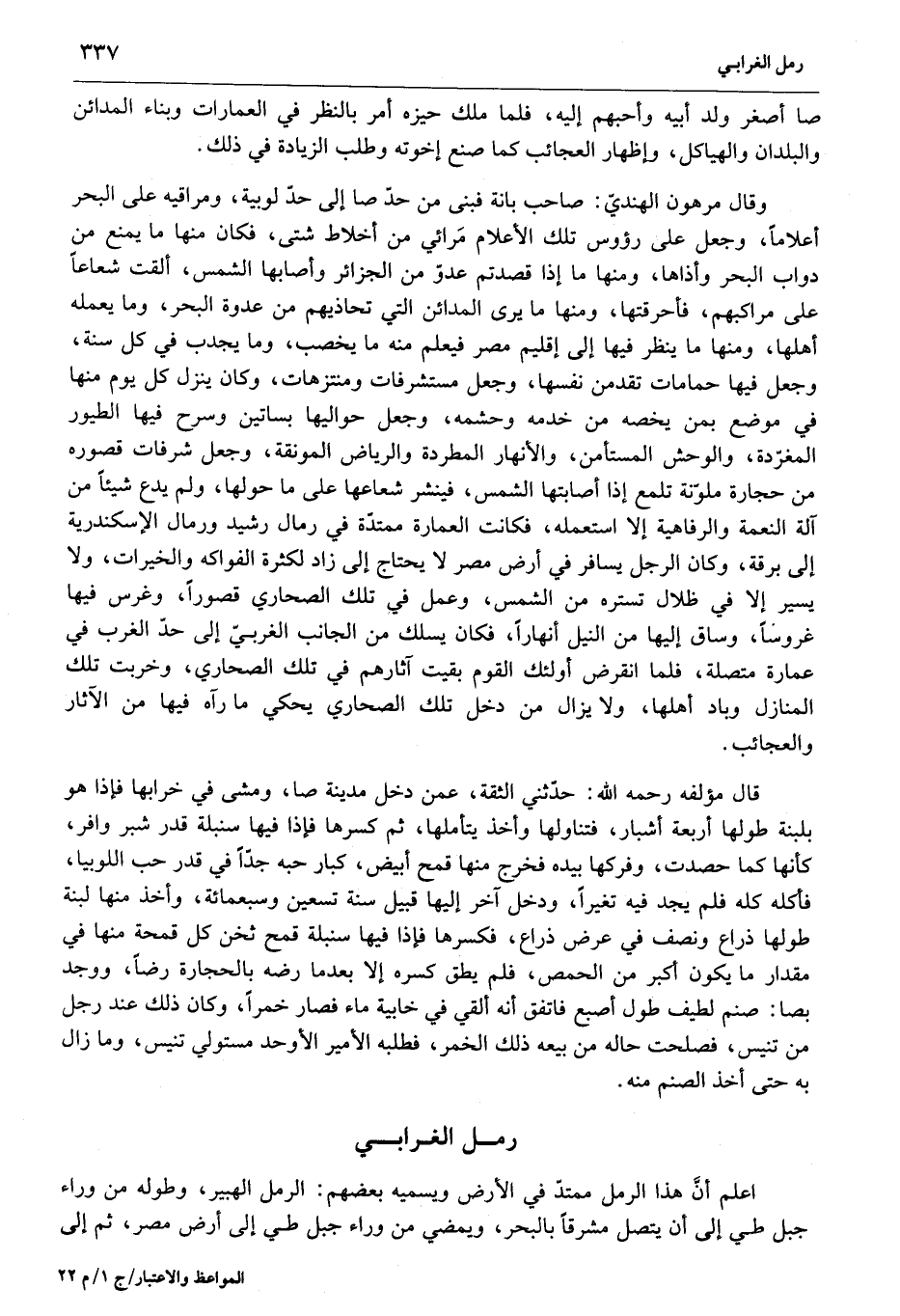 اعلم أنّ هذا الرمل ممتدّ في الأرض ويسميه بعضهم: الرمل الهبير، وطوله من وراء جبل طي إلى أن يتصل مشرقا بالبحر، ويمضي من وراء جبل طي إلى أرض مصر، ثم إلى