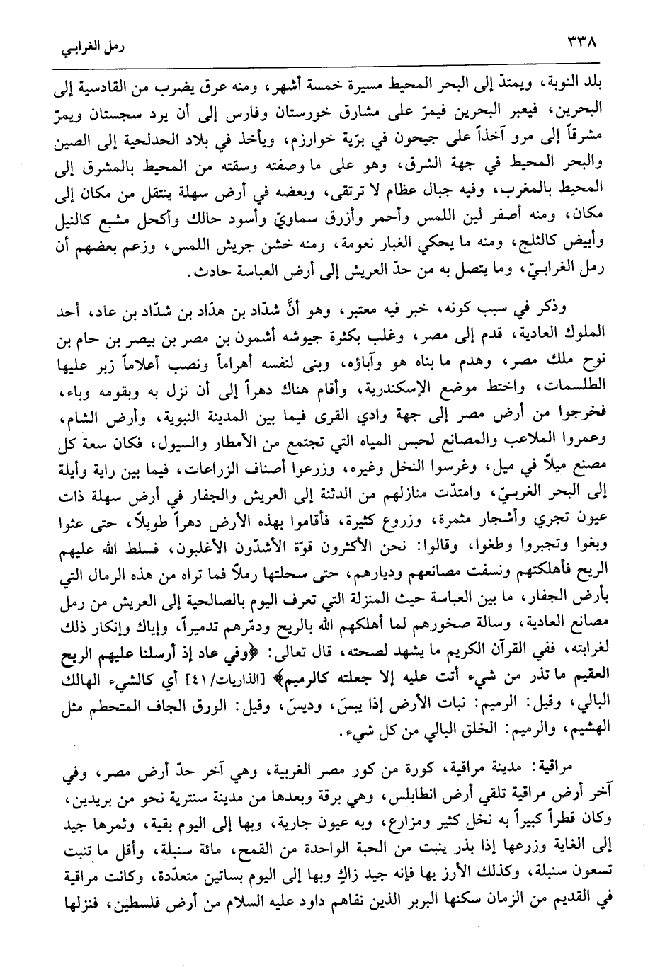 بلد النوبة، ويمتدّ إلى البحر المحيط مسيرة خمسة أشهر، ومنه عرق يضرب من القادسية إلى البحرين، فيعبر البحرين فيمرّ على مشارق خورستان وفارس إلى أن يرد سجستان ويمرّ مشرقا إلى مرو آخذا على جيحون في برّية خوارزم، ويأخذ في بلاد الحدلحية إلى الصين والبحر المحيط في جهة الشرق، وهو على ما وصفته وسقته من المحيط بالمشرق إلى المحيط بالمغرب، وفيه جبال عظام لا ترتقى، وبعضه في أرض سهلة ينتقل من مكان إلى مكان، ومنه أصفر لين اللمس وأحمر وأزرق سماويّ وأسود حالك وأكحل مشبع كالنيل وأبيض كالثلج، ومنه ما يحكي الغبار نعومة، ومنه خشن جريش اللمس، وزعم بعضهم أن رمل الغرابيّ، وما يتصل به من حدّ العريش إلى أرض العباسة حادث.