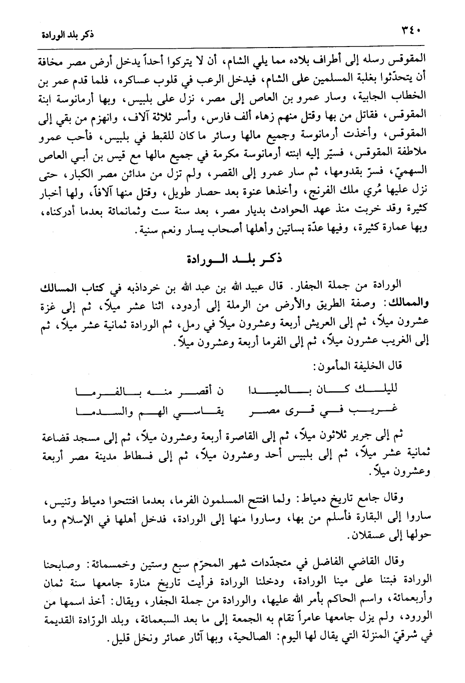 وقال جامع تاريخ دمياط: ولما افتتح المسلمون الفرما، بعد ما افتتحوا دمياط وتنيس، ساروا إلى البقارة فأسلم من بها، وساروا منها إلى الورادة، فدخل أهلها في الإسلام وما حولها إلى عسقلان.