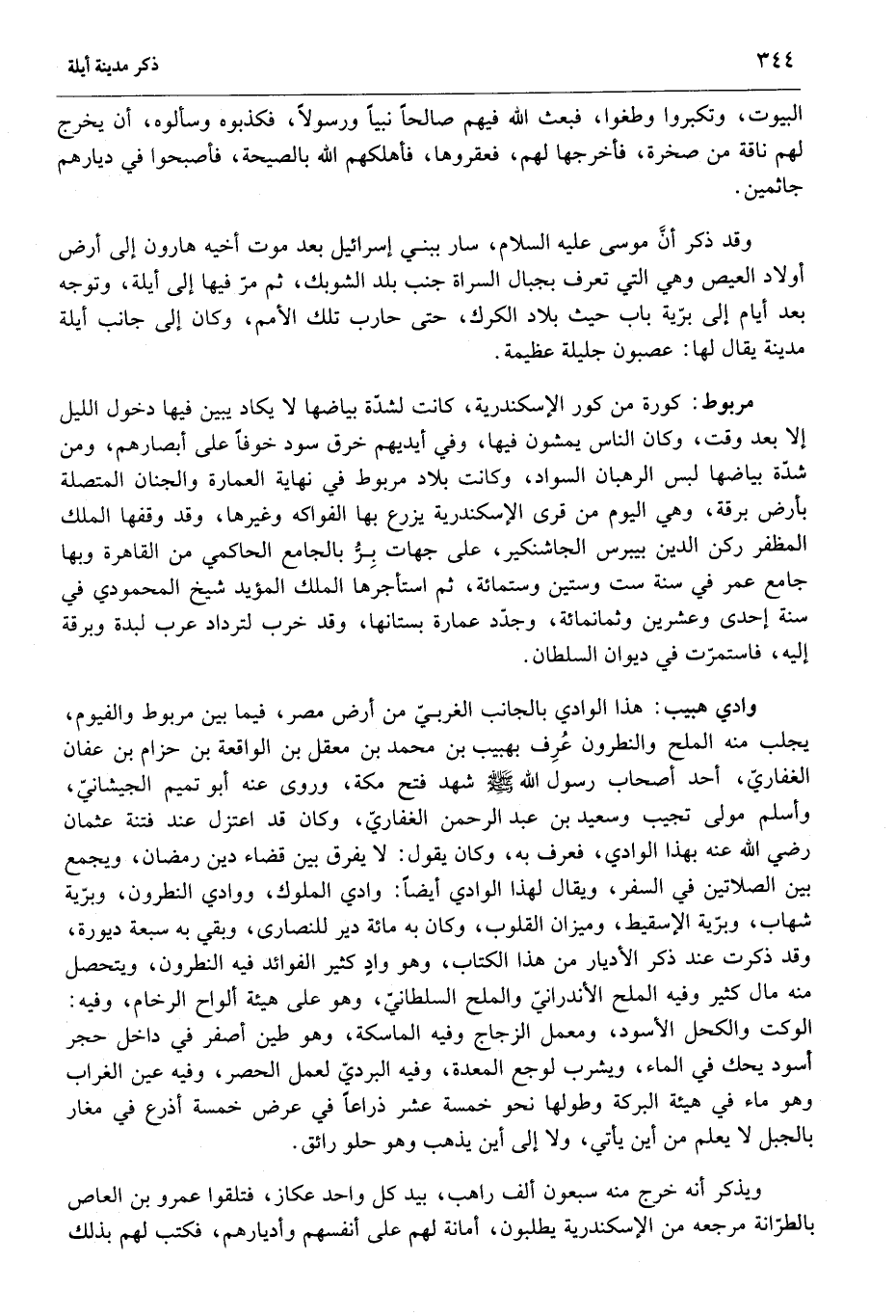 وقد ذكر أنّ موسى عليه السلام، سار ببني إسرائيل بعد موت أخيه هارون إلى أرض أولاد العيص وهي التي تعرف بجبال السراة جنب بلد الشوبك، ثم مرّ فيها إلى أيلة، وتوجه بعد أيام إلى برّية باب حيث بلاد الكرك، حتى حارب تلك الأمم، وكان إلى جانب أيلة مدينة يقال لها: عصبون جليلة عظيمة.
