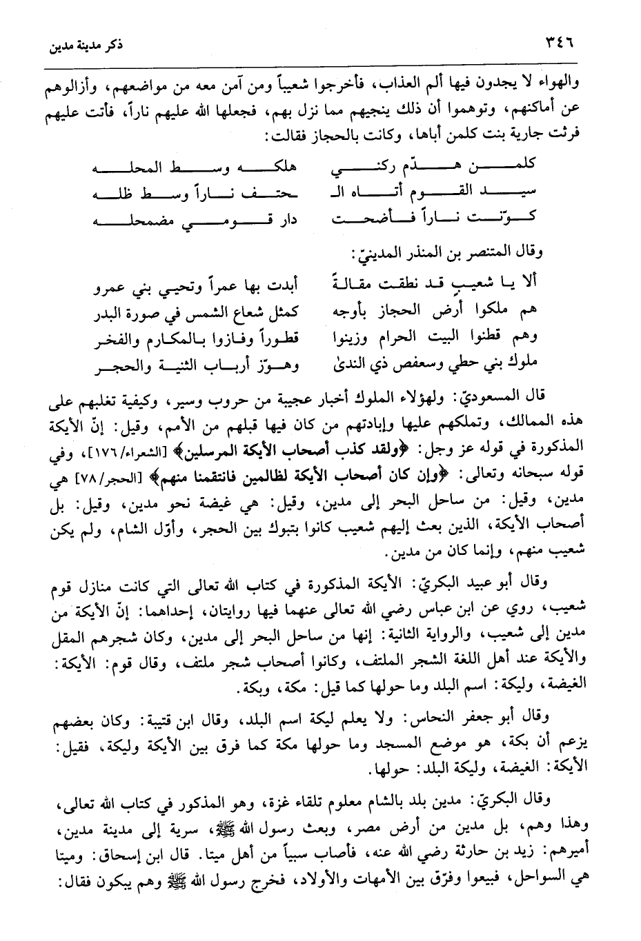 وقال أبو عبيد البكريّ: الأيكة المذكورة في كتاب الله تعالى التي كانت منازل قوم شعيب، روي عن ابن عباس رضي الله تعالى عنهما فيها روايتان، إحداهما: إنّ الأيكة من مدين إلى شعيب، والرواية الثانية: إنها من ساحل البحر إلى مدين، وكان شجرهم المقل والأيكة عند أهل اللغة الشجر الملتف، وكانوا أصحاب شجر ملتف، وقال قوم: الأيكة: