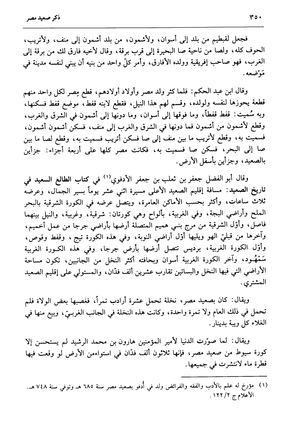 وقال أبو الفضل جعفر بن ثعلب بن جعفر الأدفوي «1» في كتاب الطالع السعيد في تاريخ الصعيد: مسافة إقليم الصعيد الأعلى مسيرة اثني عشر يوما بسير الجمال، وعرضه ثلاث ساعات، وأكثر بحسب الأماكن العامرة، ويتصل عرضه في الكورة الشرقية بالبحر الملح وأراضي البجة، وفي الغربية، بألواح وهي كورتان: شرقية، وغربية، والنيل بينهما فاصل، وأوّل الشرقية من مرج بني هميم المتصلة أرضها بأراضي جرجا من عمل أخميم، وآخرها من قبليّ الهو ويليها أوّل أراضي النوبة، وفي هذه الكورة تيج، وقفط وقوص، وأوّل الكورة الغربية، برديس تتصل أرضها بأرض جرجا، وفي هذه الكورة الغربية سمهود، وآخر الكورة الغربية أسوان وبحافته أكثر النخل من الجانبين، تكون مساحة الأراضي التي فيها النخل والبساتين تقارب عشرين ألف فدّان، والمستولي على إقليم الصعيد المشتري.