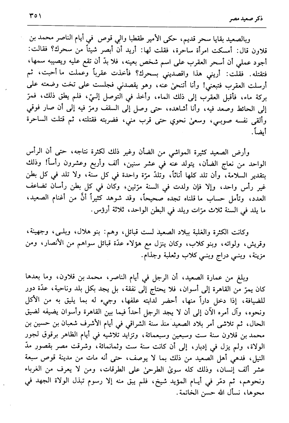 وبالصعيد بقايا سحر قديم، حكى الأمير طقطبا والي قوص في أيام الناصر محمد بن قلاون قال: أمسكت امرأة ساحرة، فقلت لها: أريد أن أبصر شيئا من سحرك؟ فقالت: