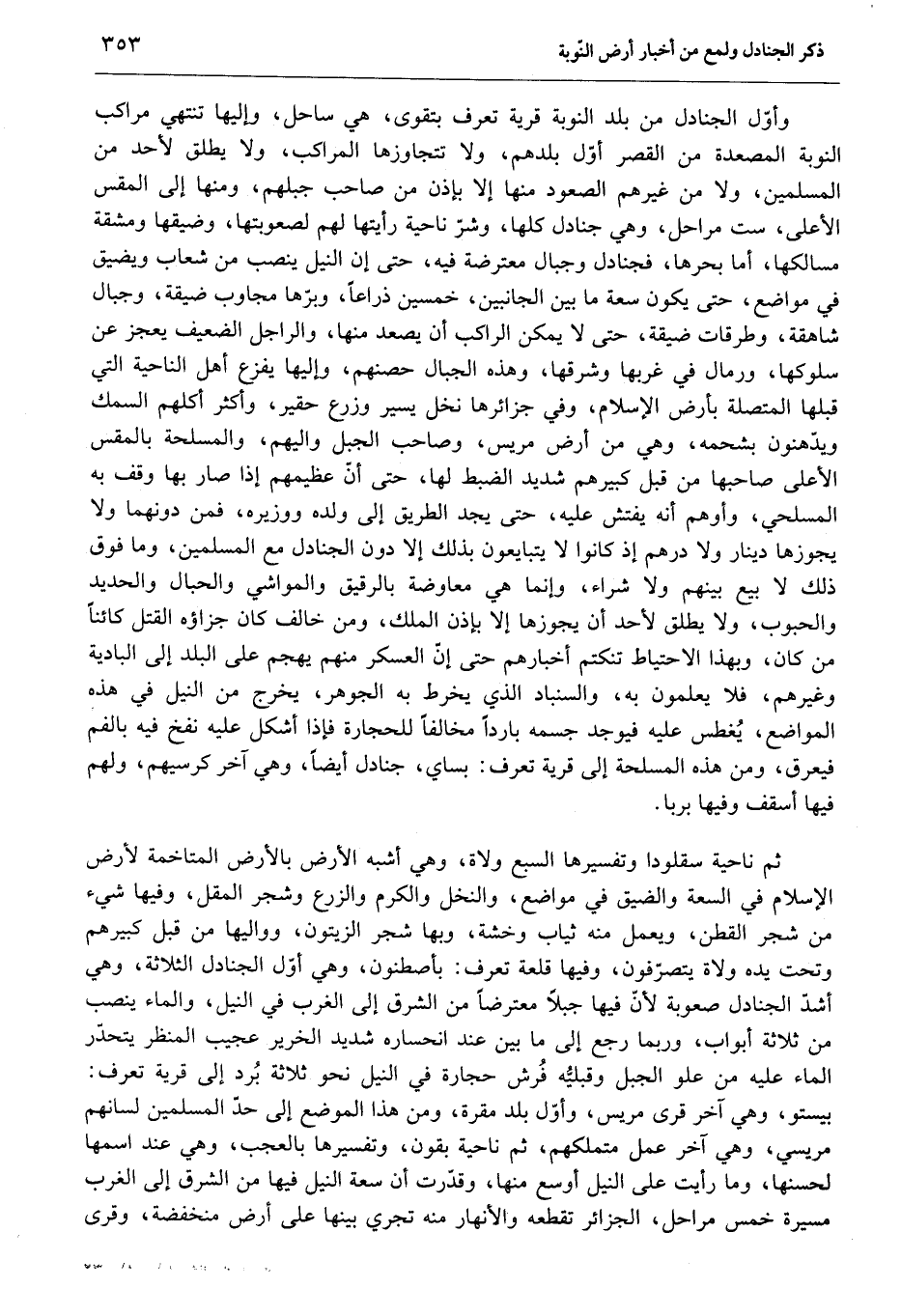 وأوّل الجنادل من بلد النوبة قرية تعرف بتقوى، هي ساحل، وإليها تنتهي مراكب النوبة المصعدة من القصر أوّل بلدهم، ولا تتجاوزها المراكب، ولا يطلق لأحد من المسلمين، ولا من غيرهم الصعود منها إلا بإذن من صاحب جبلهم، ومنها إلى المقس الأعلى، ست مراحل، وهي جنادل كلها، وشرّ ناحية رأيتها لهم لصعوبتها، وضيقها ومشقة مسالكها، أما بحرها، فجنادل وجبال معترضة فيه، حتى إن النيل ينصب من شعاب ويضيق في مواضع، حتى يكون سعة ما بين الجانبين، خمسين ذراعا، وبرّها مجاوب ضيقة، وجبال شاهقة، وطرقات ضيقة، حتى لا يمكن الراكب أن يصعد منها، والراجل الضعيف يعجز عن سلوكها، ورمال في غربها وشرقها، وهذه الجبال حصنهم، وإليها يفزع أهل الناحية التي قبلها المتصلة بأرض الإسلام، وفي جزائرها نخل يسير وزرع حقير، وأكثر أكلهم السمك ويدّهنون بشحمه، وهي من أرض مريس، وصاحب الجبل واليهم، والمسلحة بالمقس الأعلى صاحبها من قبل كبيرهم شديد الضبط لها، حتى أنّ عظيمهم إذا صار بها وقف به المسلحي، وأوهم أنه يفتش عليه، حتى يجد الطريق إلى ولده ووزيره، فمن دونهما ولا يجوزها دينار ولا درهم إذ كانوا لا يتبايعون بذلك إلا دون الجنادل مع المسلمين، وما فوق ذلك لا بيع بينهم ولا شراء، وإنما هي معاوضة بالرقيق والمواشي والحبال والحديد والحبوب، ولا يطلق لأحد أن يجوزها إلا بإذن الملك، ومن خالف كان جزاؤه القتل كائنا من كان، وبهذا الاحتياط تنكتم أخبارهم حتى إنّ العسكر منهم يهجم على البلد إلى البادية وغيرهم، فلا يعلمون به، والسنباد الذي يخرط به الجوهر، يخرج من النيل في هذه المواضع، يغطس عليه فيوجد جسمه باردا مخالفا للحجارة فإذا أشكل عليه نفخ فيه بالفم فيعرق، ومن هذه المسلحة إلى قرية تعرف: بساي، جنادل أيضا، وهي آخر كرسيهم، ولهم فيها أسقف وفيها بربا.