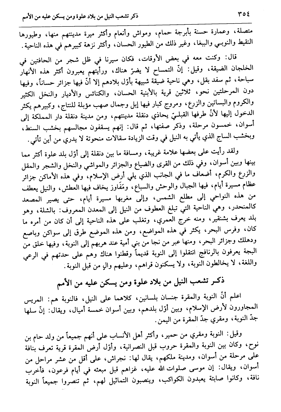 ولقد رأيت على بعضها علامة غريبة، ومسافة ما بين دنقلة إلى أوّل بلد علوة أكثر مما بينها وبين أسوان، وفي ذلك من القرى والضياع والجزائر والمواشي والنخل والشجر والمقل والزرع والكرم، أضعاف ما في الجانب الذي يلي أرض الإسلام، وفي هذه الأماكن جزائر عظام مسيرة أيام، فيها الجبال والوحش والسباع، ومفاوز يخاف فيها العطش، والنيل يعطف من هذه النواحي إلى مطلع الشمس، وإلى مغربها مسيرة أيام، حتى يصير المصعد كالمنحدر، وهي الناحية التي تبلغ العطوف من النيل إلى المعدن المعروف: بالشلة، وهو بلد يعرف بشنقير، ومنه خرج العمري، وتغلب على هذه الناحية إلى أن كان من أمره ما كان، وفرس البحر، يكثر في هذه المواضع، ومن هذه الموضع طرق إلى سواكن وباصع ودهلك وجزائر البحر، ومنها عبر من نجا من بني أمية عند هربهم إلى النوبة، وفيها خلق من البجة يعرفون بالرنافج انتقلوا إلى النوبة قديما وقطنوا هناك وهم على حدتهم في الرعي واللغة، لا يخالطون النوبة، ولا يسكنون قراهم، وعليهم وال من قبل النوبة.