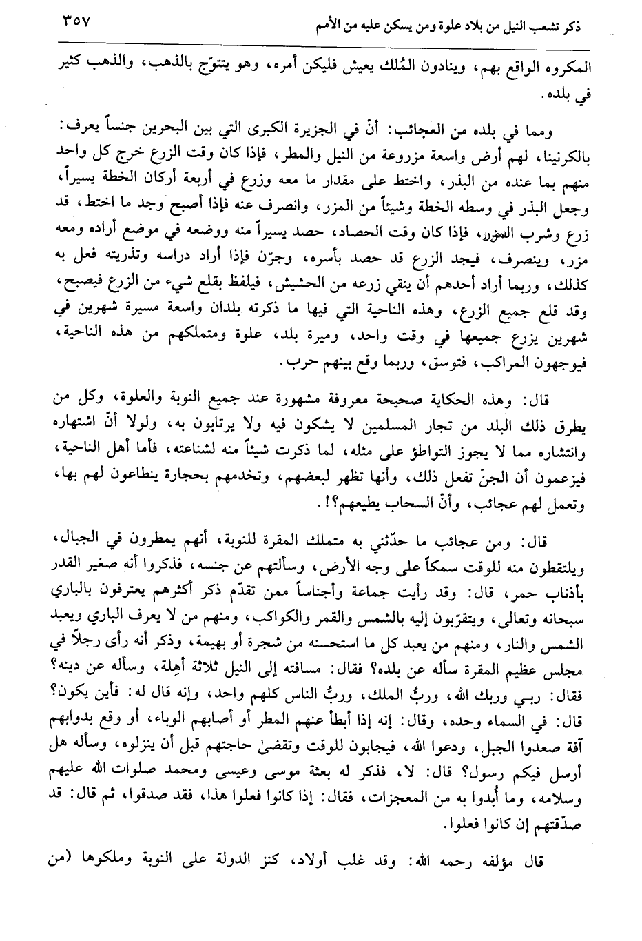 قال: ومن عجائب ما حدّثني به متملك المقرة للنوبة، أنهم يمطرون في الجبال، ويلتقطون منه للوقت سمكا على وجه الأرض، وسألتهم عن جنسه، فذكروا أنه صغير القدر بأذناب حمر، قال: وقد رأيت جماعة وأجناسا ممن تقدّم ذكر أكثرهم يعترفون بالباري سبحانه وتعالى، ويتقرّبون إليه بالشمس والقمر والكواكب، ومنهم من لا يعرف الباري ويعبد الشمس والنار، ومنهم من يعبد كل ما استحسنه من شجرة أو بهيمة، وذكر أنه رأى رجلا في مجلس عظيم المقرة سأله عن بلده؟ فقال: مسافته إلى النيل ثلاثة أهلة، وسأله عن دينه؟