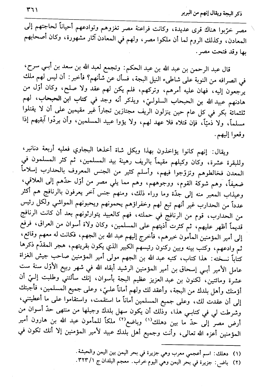 ويقال: إنهم كانوا يؤاخذون بهذا وبكل شاة أخذها البجاوي فعليه أربعة دنانير، وللبقرة عشرة، وكان وكيلهم مقيما بالريف رهينة بيد المسلمين، ثم كثر المسلمون في المعدن فخالطوهم وتزوّجوا فيهم، وأسلم كثير من الجنس المعروف بالحدارب إسلاما ضعيفا، وهم شوكة القوم، ووجوههم، وهم مما يلي مصر من أوّل حدّهم إلى العلاقي، وعيذاب المعبر منه إلى جدّة وما وراء ذلك، ومنهم جنس آخر يعرفون بالرنافج هم أكثر عددا من الحدارب غير أنهم تبع لهم وخفراؤهم يحمونهم ويحبونهم المواشي ولكل رئيس من الحدارب، قوم من الرنافج في حملته، فهم كالعبيد يتوارثونهم بعد أن كانت الرنافج قديما أظهر عليهم، ثم كثرت أذيتهم على المسلمين، وكان ولاة أسوان من العراق، فرفع إلى أمير المؤمنين المأمون خبرهم، فأخرج إليهم عبد الله بن الجهم، فكانت له معهم وقائع، ثم وادعهم، وكتب بينه وبين ركنون رئيسهم الكبير الذي يكون بقريتهم، هجر المقدّم ذكرها كتابا نسخته: هذا كتاب، كتبه عبد الله بن الجهم مولى أمير المؤمنين صاحب جيش الغزاة عامل الأمير أبي إسحاق بن أمير المؤمنين الرشيد أبقاه الله في شهر ربيع الأوّل سنة ست عشرة ومائتين، لكنون بن عبد العزيز عظيم البجة بأسوان، إنك سألتني وطلبت إليّ أن أؤمنك وأهل بلدك من البجة، وأعقد لك ولهم أمانا عليّ، وعلى جميع المسلمين، فأجبتك إلى أن عقدت لك، وعلى جميع المسلمين أمانا ما استقمت، واستقاموا على ما أعطيتني، وشرطت لي في كتابي هذا، وذلك أن يكون سهل بلدك وجبلها من منتهى حدّ أسوان من أرض مصر إلى حدّ ما بين دهلك «1» وباضع «2» ملكا للمأمون عبد الله بن هارون أمير المؤمنين أعزه الله تعالى، وأنت وجميع أهل بلدك عبيد لأمير المؤمنين إلا أنك تكون في