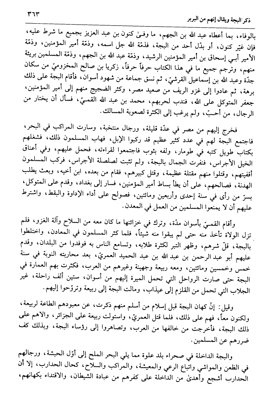 بالوفاء، بما أعطاه عبد الله بن الجهم، ما وفى كنون بن عبد العزيز بجميع ما شرط عليه، فإن غيّر كنون، أو بدّل أحد من البجة، فذمّة الله جل اسمه، وذمّة أمير المؤمنين، وذمّة الأمير أبي إسحاق بن أمير المؤمنين الرشيد، وذمّة عبد الله بن الجهم، وذمّة المسلمين بريئة منهم، وترجم جميع ما في هذا الكتاب حرفا حرفا، زكريا بن صالح المخزوميّ من سكان جدّة وعبد الله بن إسماعيل القرشيّ، ثم نسق جماعة من شهود أسوان، فأقام البجة على ذلك برهة، ثم عادوا إلى غزو الريف من صعيد مصر، وكثر الضجيج منهم إلى أمير المؤمنين، جعفر المتوكل على الله، فندب لحربهم، محمد بن عبد الله القميّ، فسأل أن يختار من الرجال، من أحبّ، ولم يرغب إلى الكثرة لصعوبة المسالك.