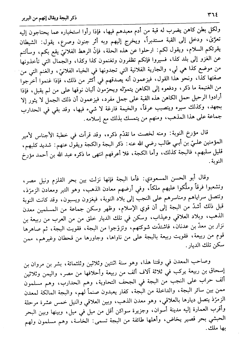 وقال أبو الحسن المسعودي: فأما البجة فإنها نزلت بين بحر القلزم ونيل مصر، وتشعبوا فرقا وملّكوا عليهم ملكا، وفي أرضهم معادن الذهب، وهو التبر ومعادن الزمرّذ، وتتصل سراياهم ومناسرهم على النجب إلى بلاد النوبة، فيغزون ويسبون، وقد كانت النوبة قبل ذلك أشدّ من البجة إلى أن قوي الإسلام، وظهر وسكن جماعة من المسلمين معدن الذهب، وبلاد العلاقي وعيذاب، وسكن في تلك الديار خلق من من العرب من ربيعة بن نزار بن معدّ بن عدنان، فاشتدّت شوكتهم، وتزوّجوا من البجة، فقويت البجة، ثم صاهرها قوم من ربيعة، فقويت ربيعة بالبجة على من ناواها، وجاورها من قحطان وغيرهم، ممن سكن تلك الديار.