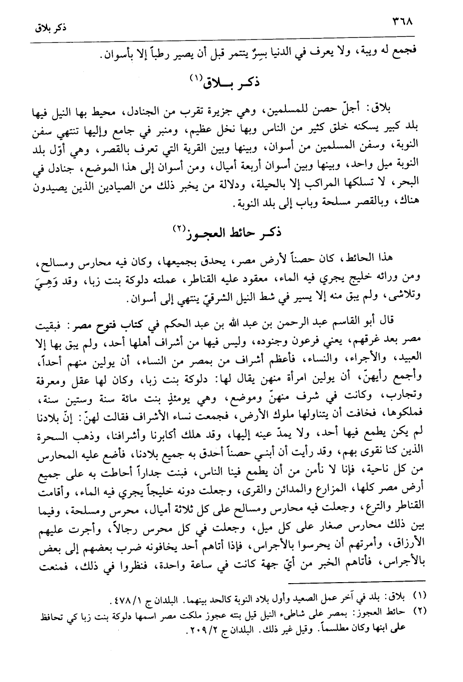 بلاق: أجلّ حصن للمسلمين، وهي جزيرة تقرب من الجنادل، محيط بها النيل فيها بلد كبير يسكنه خلق كثير من الناس وبها نخل عظيم، ومنبر في جامع وإليها تنتهي سفن النوبة، وسفن المسلمين من أسوان، وبينها وبين القرية التي تعرف بالقصر، وهي أوّل بلد النوبة ميل واحد، وبينها وبين أسوان أربعة أميال، ومن أسوان إلى هذا الموضع، جنادل في البحر، لا تسلكها المراكب إلا بالحيلة، ودلالة من يخبر ذلك من الصيادين الذين يصيدون هناك، وبالقصر مسلحة وباب إلى بلد النوبة.