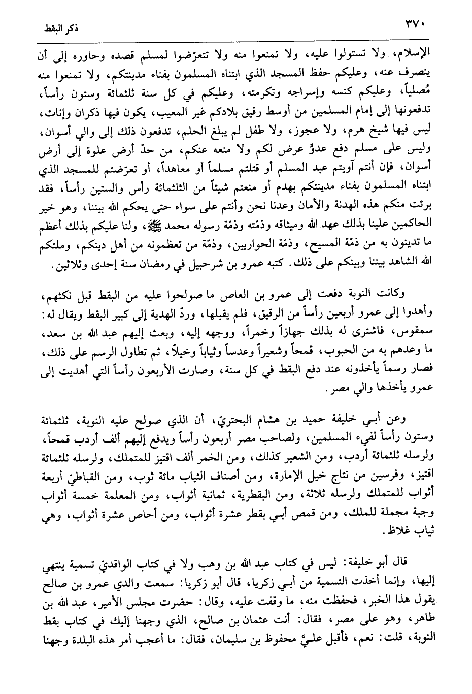 الإسلام، ولا تستولوا عليه، ولا تمنعوا منه ولا تتعرّضوا لمسلم قصده وحاوره إلى أن ينصرف عنه، وعليكم حفظ المسجد الذي ابتناه المسلمون بفناء مدينتكم، ولا تمنعوا منه مصليا، وعليكم كنسه وإسراجه وتكرمته، وعليكم في كل سنة ثلثمائة وستون رأسا، تدفعونها إلى إمام المسلمين من أوسط رقيق بلادكم غير المعيب، يكون فيها ذكران وإناث، ليس فيها شيخ هرم، ولا عجوز، ولا طفل لم يبلغ الحلم، تدفعون ذلك إلى والي أسوان، وليس على مسلم دفع عدوّ عرض لكم ولا منعه عنكم، من حدّ أرض علوة إلى أرض أسوان، فإن أنتم آويتم عبد المسلم أو قتلتم مسلما أو معاهدا، أو تعرّضتم للمسجد الذي ابتناه المسلمون بفناء مدينتكم بهدم أو منعتم شيئا من الثلاثمائة رأس والستين رأسا، فقد برئت منكم هذه الهدنة والأمان وعدنا نحن وأنتم على سواء حتى يحكم الله بيننا، وهو خير الحاكمين علينا بذلك عهد الله وميثاقه وذمّته وذمّة رسوله محمد صلى الله عليه وسلم، ولنا عليكم بذلك أعظم ما تدينون به من ذمّة المسيح، وذمّة الحواريين، وذمّة من تعظمونه من أهل دينكم، وملتكم الله الشاهد بيننا وبينكم على ذلك. كتبه عمرو بن شرحبيل في رمضان سنة إحدى وثلاثين.