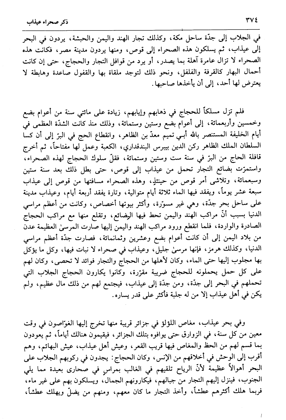 في الجلاب إلى جدّة ساحل مكة، وكذلك تجار الهند واليمن والحبشة، يردون في البحر إلى عيذاب، ثم يسلكون هذه الصحراء إلى قوص، ومنها يردون مدينة مصر، فكانت هذه الصحراء لا تزال عامرة آهلة بما يصدر، أو يرد من قوافل التجار والحجاج، حتى إن كانت أحمال البهار كالقرفة والفلفل، ونحو ذلك لتوجد ملقاة بها والقفول صاعدة وهابطة لا يعترض لها أحد، إلى أن يأخذها صاحبها.