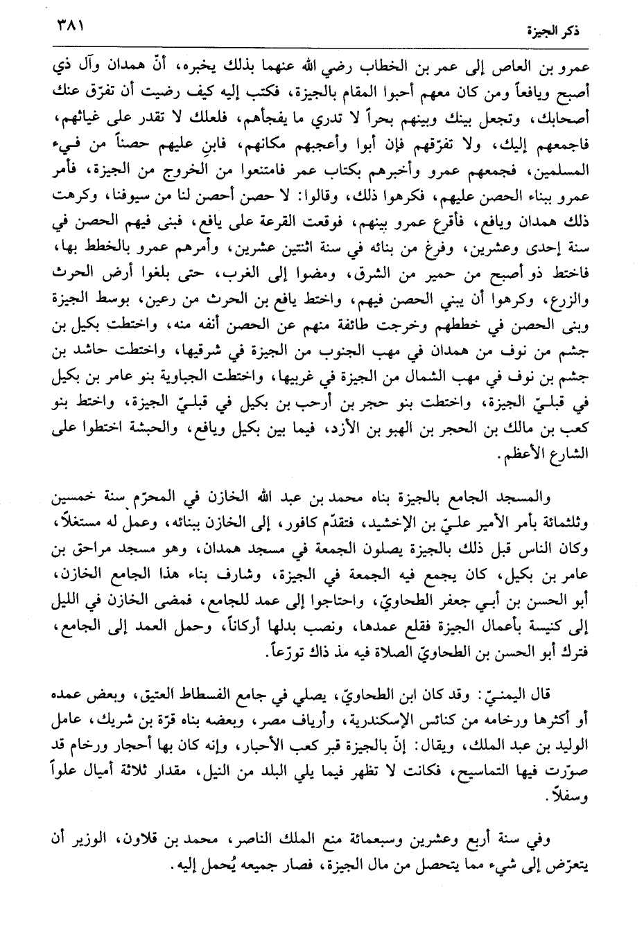 عمرو بن العاص إلى عمر بن الخطاب رضي الله عنهما بذلك يخبره، أنّ همدان وآل ذي أصبح ويافعا ومن كان معهم أحبوا المقام بالجيزة، فكتب إليه كيف رضيت أن تفرّق عنك أصحابك، وتجعل بينك وبينهم بحرا لا تدري ما يفجأهم، فلعلك لا تقدر على غياثهم، فاجمعهم إليك، ولا تفرّقهم فإن أبوا وأعجبهم مكانهم، فابن عليهم حصنا من فيء المسلمين، فجمعهم عمرو وأخبرهم بكتاب عمر فامتنعوا من الخروج من الجيزة، فأمر عمرو ببناء الحصن عليهم، فكرهوا ذلك، وقالوا: لا حصن أحصن لنا من سيوفنا، وكرهت ذلك همدان ويافع، فأقرع عمرو بينهم، فوقعت القرعة على يافع، فبنى فيهم الحصن في سنة إحدى وعشرين، وفرغ من بنائه في سنة اثنتين عشرين، وأمرهم عمرو بالخطط بها، فاختط ذو أصبح من حمير من الشرق، ومضوا إلى الغرب، حتى بلغوا أرض الحرث والزرع، وكرهوا أن يبني الحصن فيهم، واختط يافع بن الحرث من رعين، بوسط الجيزة وبنى الحصن في خططهم وخرجت طائفة منهم عن الحصن أنفه منه، واختطت بكيل بن جشم من نوف من همدان في مهب الجنوب من الجيزة في شرقيها، واختطت حاشد بن جشم من نوف في مهب الشمال من الجيزة في غربيها، واختطت الجباوية بنو عامر بن بكيل في قبليّ الجيزة، واختطت بنو حجر بن أرحب بن بكيل في قبليّ الجيزة، واختط بنو كعب بن مالك بن الحجر بن الهبو بن الأزد، فيما بين بكيل ويافع، والحبشة اختطوا على الشارع الأعظم.