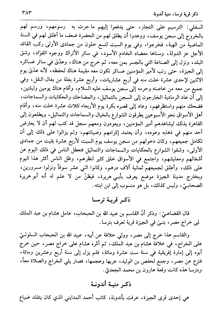 السفلي: الترسيم على التجار، حتى يدفعوا إليهم ما جرت به رسومهم، ورسم لهم بالخروج إلى سجن يوسف، ووعدوا أن يطلق لهم من الحضرة ضعف ما أطلق لهم في السنة الماضية من الهبة، فخرجوا، وفي يوم السبت لتسع خلون من جمادى الأولى ركب القائد الأجل عز الدولة، وسناها معضاد الخادم الأسود، في سائر الأتراك ووجوه القوّاد، وشق البلد، ونزل إلى الصناعة التي بالجسر بمن معه، ثم خرج من هناك، وعدّى في سائر عساكره إلى الجيزة، حتى رتب لأمير المؤمنين عساكر تكون معه مقيمة هناك لحفظه، لأنه عدّى يوم الاثنين لإحدى عشرة خلت منه في أربع عشاريات، وأربع عشرة بغلة من بغال النقل، وفي جميع من معه من خاصته وحرمه إلى سجن يوسف عليه السلام، وأقام هناك يومين وليلتين، إلى أن عاد الرمادية الخارجون إلى السجن بالتماثيل، والمضاحك والحكايات والسماجات، فضحك منهم واستظرفهم، وعاد إلى قصره بكرة يوم الأربعاء لثلاث عشرة خلت منه، وأقام أهل الأسواق نحو الأسبوعين يطرقون الشوارع بالخيال والسماجات والتماثيل، ويطلعون إلى القاهرة بذلك ليشاهدهم أمير المؤمنين، ويعودون ومعهم سجل قد كتب لهم أن لا يعارض أحد منهم في ذهابه وعوده، وأن يعتمد إكرامهم وصيانتهم، ولم يزالوا على ذلك إلى أن تكامل جميعهم، وكان دخولهم من سجن يوسف يوم السبت لأربع عشرة بقيت من جمادى الأولى، وشقوا الشوارع بالحكايات والسماجات والتماثيل فتعطل الناس في ذلك اليوم عن أشغالهم ومعايشهم، واجتمع في الأسواق خلق كثير لنظرهم، وظل الناس أكثر هذا اليوم على ذلك، وأطلق لجميعهم ثمانية آلاف درهم، وكانوا اثني عشر سوقا ونزلوا مسرورين، وبخارج مدينة الجيزة موضع يعرف بأبي هريرة، فيظنّ من لا علم له أنه أبو هريرة الصحابيّ، وليس كذلك، بل هو منسوب إلى ابن ابنته.