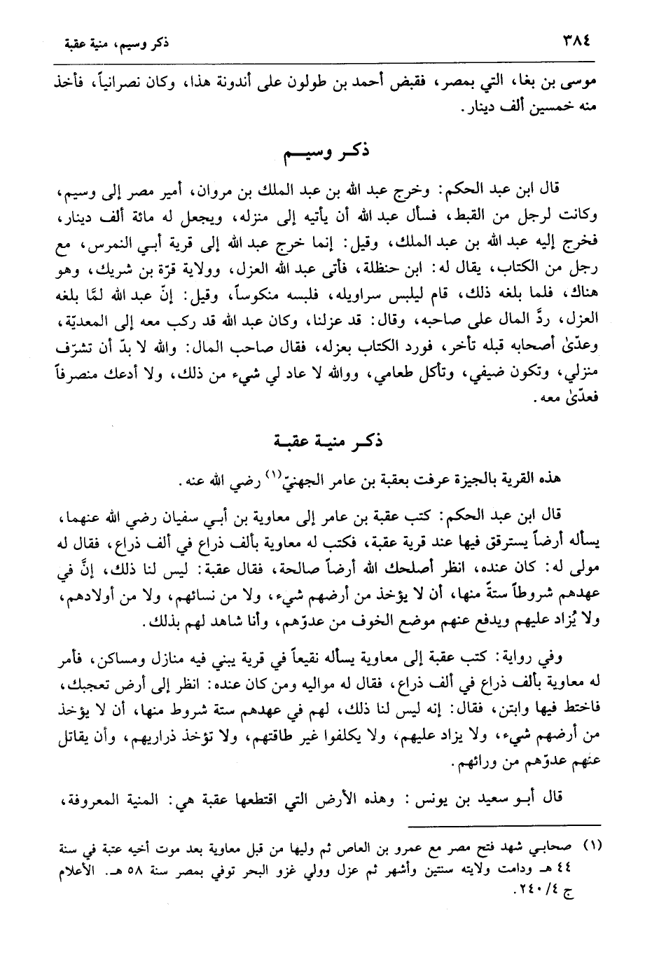 قال أبو سعيد بن يونس: وهذه الأرض التي اقتطعها عقبة هي: المنية المعروفة،