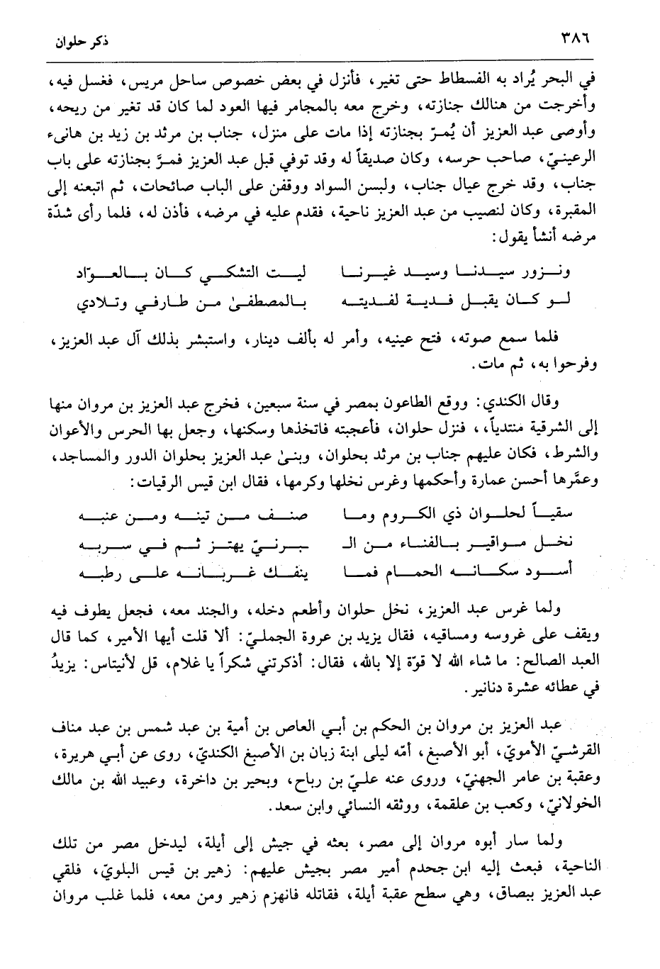 وقال الكندي: ووقع الطاعون بمصر في سنة سبعين، فخرج عبد العزيز بن مروان منها إلى الشرقية منتديا، فنزل حلوان، فأعجبته فاتخذها وسكنها، وجعل بها الحرس والأعوان والشرط، فكان عليهم جناب بن مرثد بحلوان، وبنى عبد العزيز بحلوان الدور والمساجد، وعمّرها أحسن عمارة وأحكمها وغرس نخلها وكرمها، فقال ابن قيس الرقيات: