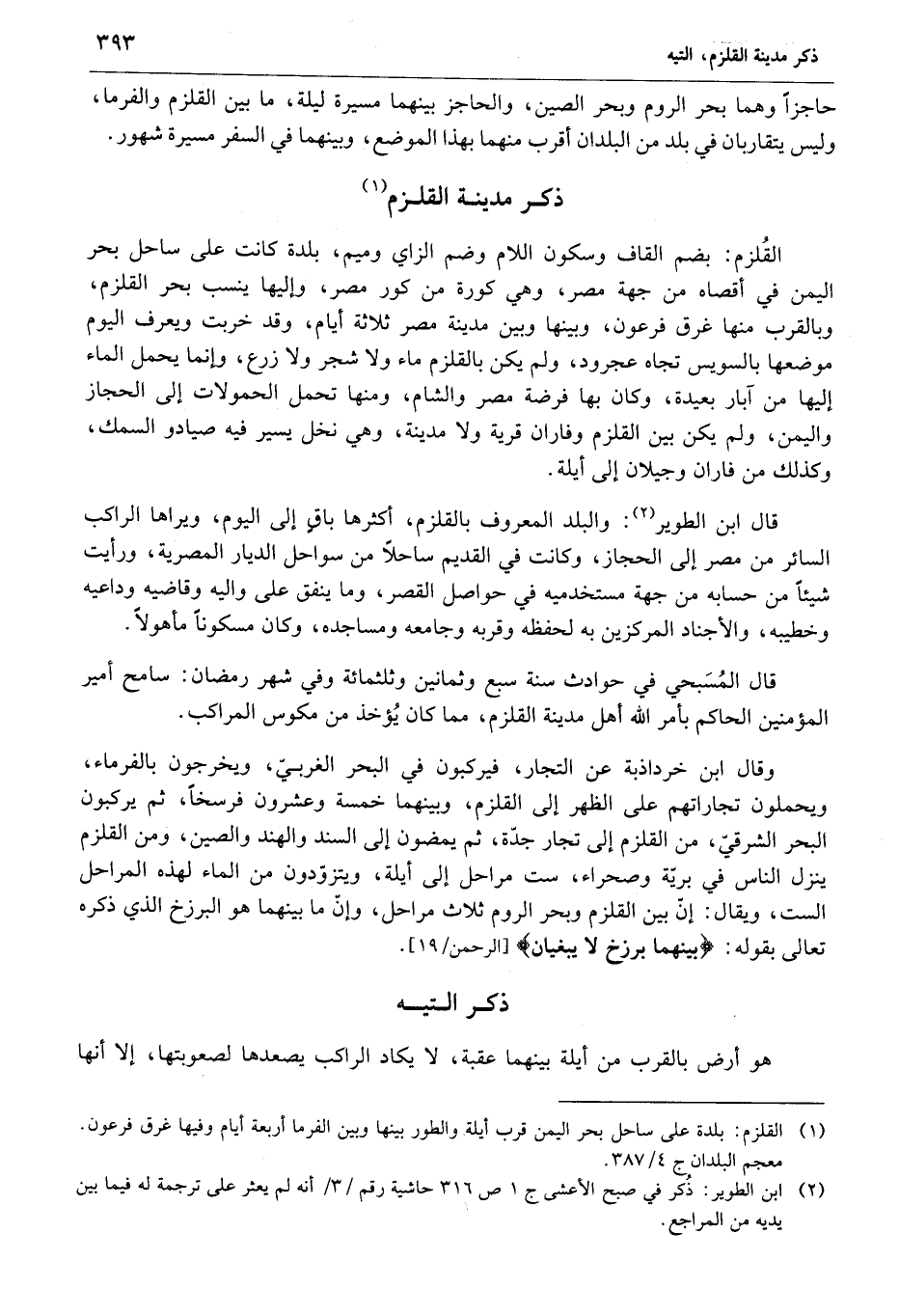 وقال ابن خرداذبة عن التجار، فيركبون في البحر الغربيّ، ويخرجون بالفرماء، ويحملون تجاراتهم على الظهر إلى القلزم، وبينهما خمسة وعشرون فرسخا، ثم يركبون البحر الشرقيّ، من القلزم إلى تجار جدّة، ثم يمضون إلى السند والهند والصين، ومن القلزم ينزل الناس في بريّة وصحراء، ست مراحل إلى أيلة، ويتزوّدون من الماء لهذه المراحل الست، ويقال: إنّ بين القلزم وبحر الروم ثلاث مراحل، وإنّ ما بينهما هو البرزخ الذي ذكره تعالى بقوله: بَيْنَهُما بَرْزَخٌ لا يَبْغِيانِ