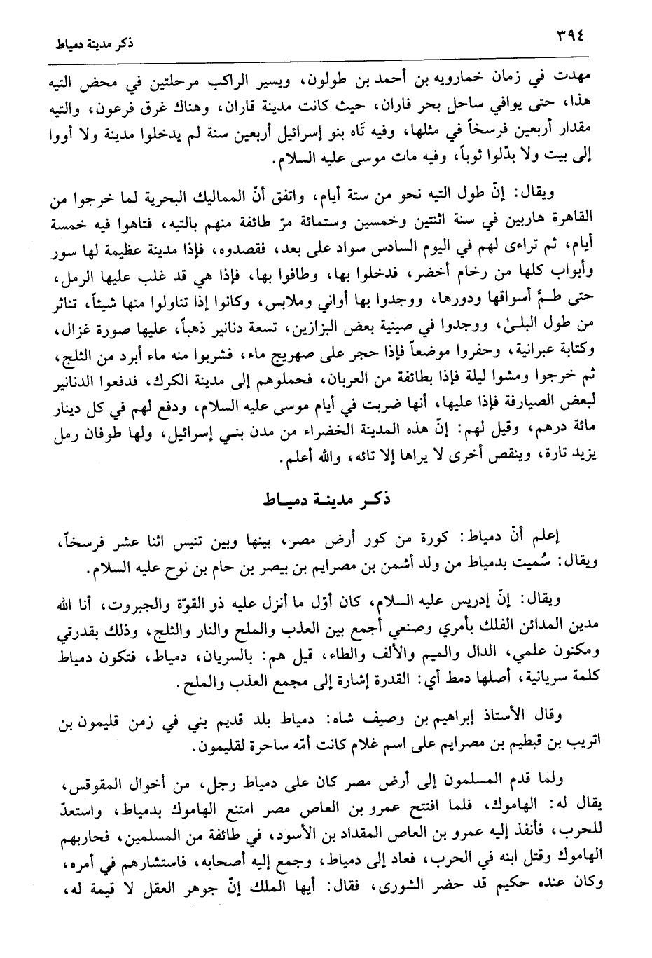 مهدت في زمان خمارويه بن أحمد بن طولون، ويسير الراكب مرحلتين في محض التيه هذا، حتى يوافي ساحل بحر فاران، حيث كانت مدينة قاران، وهناك غرق فرعون، والتيه مقدار أربعين فرسخا في مثلها، وفيه تاه بنو إسرائيل أربعين سنة لم يدخلوا مدينة ولا أووا إلى بيت ولا بدّلوا ثوبا، وفيه مات موسى عليه السلام.