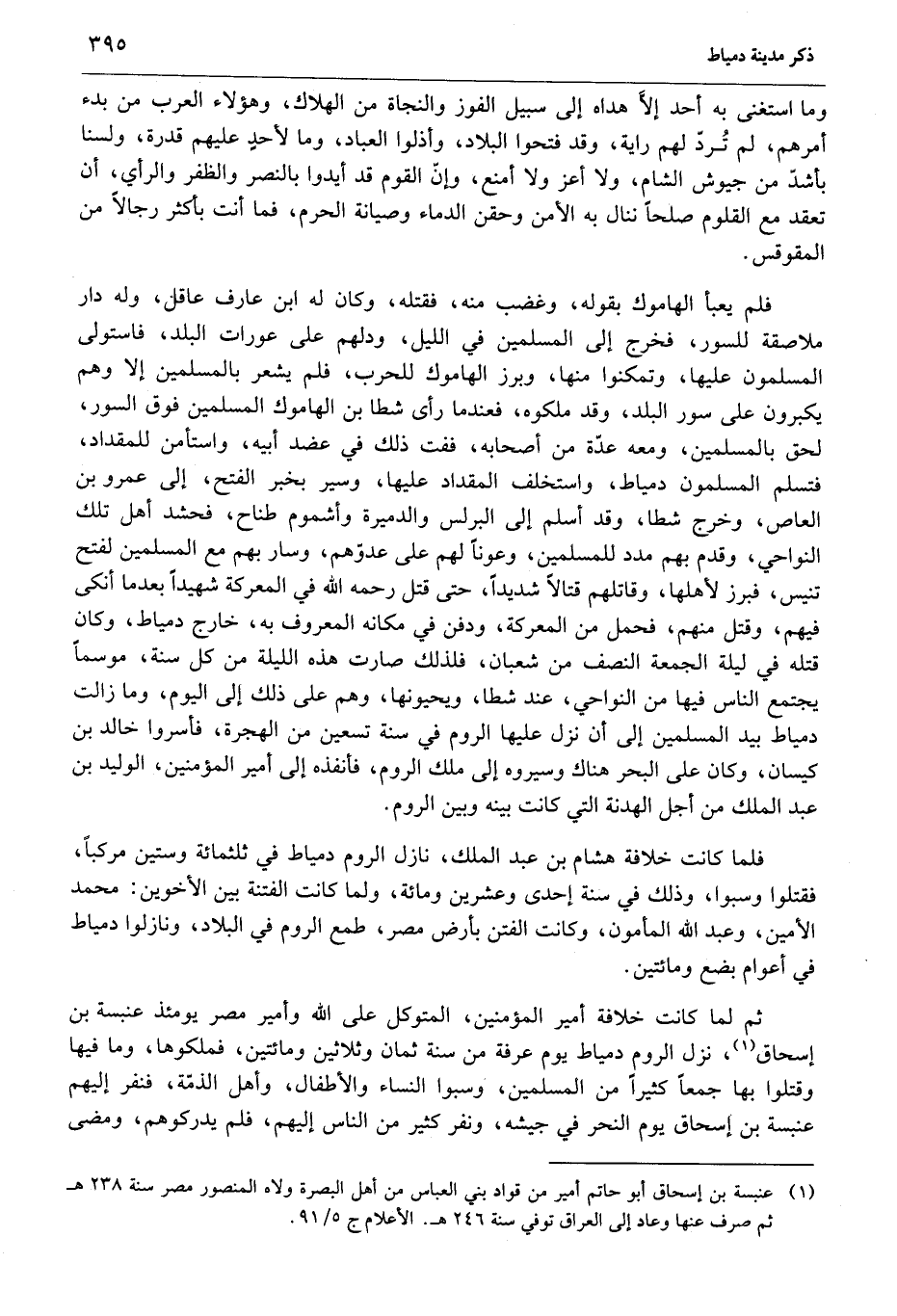 فلم يعبأ الهاموك بقوله، وغضب منه، فقتله، وكان له ابن عارف عاقل، وله دار ملاصقة للسور، فخرج إلى المسلمين في الليل، ودلهم على عورات البلد، فاستولى المسلمون عليها، وتمكنوا منها، وبرز الهاموك للحرب، فلم يشعر بالمسلمين إلا وهم يكبرون على سور البلد، وقد ملكوه، فعند ما رأى شطا بن الهاموك المسلمين فوق السور، لحق بالمسلمين، ومعه عدّة من أصحابه، ففت ذلك في عضد أبيه، واستأمن للمقداد، فتسلم المسلمون دمياط، واستخلف المقداد عليها، وسير بخبر الفتح، إلى عمرو بن العاص، وخرج شطا، وقد أسلم إلى البرلس والدميرة وأشموم طناح، فحشد أهل تلك النواحي، وقدم بهم مدد للمسلمين، وعونا لهم على عدوّهم، وسار بهم مع المسلمين لفتح تنيس، فبرز لأهلها، وقاتلهم قتالا شديدا، حتى قتل رحمه الله في المعركة شهيدا بعد ما أنكى فيهم، وقتل منهم، فحمل من المعركة، ودفن في مكانه المعروف به، خارج دمياط، وكان قتله في ليلة الجمعة النصف من شعبان، فلذلك صارت هذه الليلة من كل سنة، موسما يجتمع الناس فيها من النواحي، عند شطا، ويحيونها، وهم على ذلك إلى اليوم، وما زالت دمياط بيد المسلمين إلى أن نزل عليها الروم في سنة تسعين من الهجرة، فأسروا خالد بن كيسان، وكان على البحر هناك وسيروه إلى ملك الروم، فأنفذه إلى أمير المؤمنين، الوليد بن عبد الملك من أجل الهدنة التي كانت بينه وبين الروم.