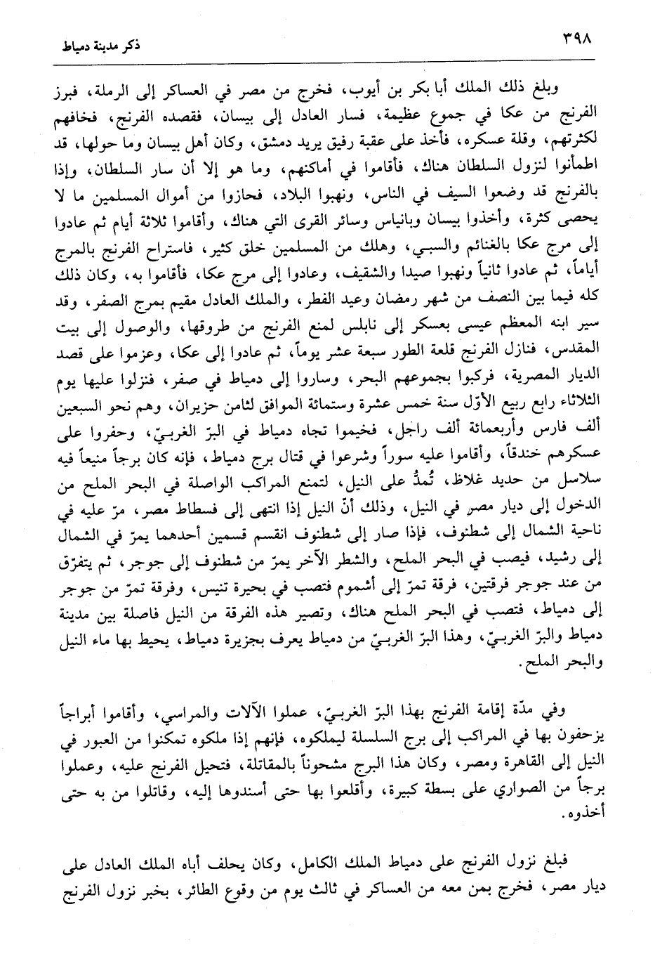 وبلغ ذلك الملك أبا بكر بن أيوب، فخرج من مصر في العساكر إلى الرملة، فبرز الفرنج من عكا في جموع عظيمة، فسار العادل إلى بيسان، فقصده الفرنج، فخافهم لكثرتهم، وقلة عسكره، فأخذ على عقبة رفيق يريد دمشق، وكان أهل بيسان وما حولها، قد اطمأنوا لنزول السلطان هناك، فأقاموا في أماكنهم، وما هو إلا أن سار السلطان، وإذا بالفرنج قد وضعوا السيف في الناس، ونهبوا البلاد، فحازوا من أموال المسلمين ما لا يحصى كثرة، وأخذوا بيسان وبانياس وسائر القرى التي هناك، وأقاموا ثلاثة أيام ثم عادوا إلى مرج عكا بالغنائم والسبي، وهلك من المسلمين خلق كثير، فاستراح الفرنج بالمرج أياما، ثم عادوا ثانيا ونهبوا صيدا والشقيف، وعادوا إلى مرج عكا، فأقاموا به، وكان ذلك كله فيما بين النصف من شهر رمضان وعيد الفطر، والملك العادل مقيم بمرج الصفر، وقد سير ابنه المعظم عيسى بعسكر إلى نابلس لمنع الفرنج من طروقها، والوصول إلى بيت المقدس، فنازل الفرنج قلعة الطور سبعة عشر يوما، ثم عادوا إلى عكا، وعزموا على قصد الديار المصرية، فركبوا بجموعهم البحر، وساروا إلى دمياط في صفر، فنزلوا عليها يوم الثلاثاء رابع ربيع الأوّل سنة خمس عشرة وستمائة الموافق لثامن حزيران، وهم نحو السبعين ألف فارس وأربعمائة ألف راجل، فخيموا تجاه دمياط في البرّ الغربيّ، وحفروا على عسكرهم خندقا، وأقاموا عليه سورا وشرعوا في قتال برج دمياط، فإنه كان برجا منيعا فيه سلاسل من حديد غلاظ، تمدّ على النيل، لتمنع المراكب الواصلة في البحر الملح من الدخول إلى ديار مصر في النيل، وذلك أنّ النيل إذا انتهى إلى فسطاط مصر، مرّ عليه في ناحية الشمال إلى شطنوف، فإذا صار إلى شطنوف انقسم قسمين أحدهما يمرّ في الشمال إلى رشيد، فيصب في البحر الملح، والشطر الآخر يمرّ من شطنوف إلى جوجر، ثم يتفرّق من عند جوجر فرقتين، فرقة تمرّ إلى أشموم فتصب في بحيرة تنيس، وفرقة تمرّ من جوجر إلى دمياط، فتصب في البحر الملح هناك، وتصير هذه الفرقة من النيل فاصلة بين مدينة دمياط والبرّ الغربيّ، وهذا البرّ الغربيّ من دمياط يعرف بجزيرة دمياط، يحيط بها ماء النيل والبحر الملح.