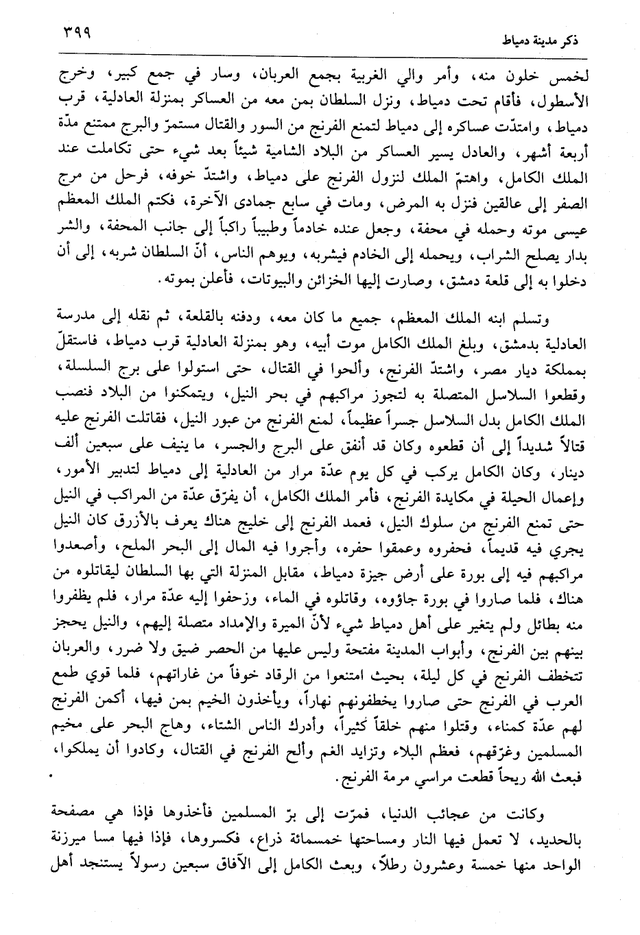 لخمس خلون منه، وأمر والي الغربية بجمع العربان، وسار في جمع كبير، وخرج الأسطول، فأقام تحت دمياط، ونزل السلطان بمن معه من العساكر بمنزلة العادلية، قرب دمياط، وامتدّت عساكره إلى دمياط لتمنع الفرنج من السور والقتال مستمرّ والبرج ممتنع مدّة أربعة أشهر، والعادل يسير العساكر من البلاد الشامية شيئا بعد شيء حتى تكاملت عند الملك الكامل، واهتمّ الملك لنزول الفرنج على دمياط، واشتدّ خوفه، فرحل من مرج الصفر إلى عالقين فنزل به المرض، ومات في سابع جمادى الآخرة، فكتم الملك المعظم عيسى موته وحمله في محفة، وجعل عنده خادما وطبيبا راكبا إلى جانب المحفة، والشر بدار يصلح الشراب، ويحمله إلى الخادم فيشربه، ويوهم الناس، أنّ السلطان شربه، إلى أن دخلوا به إلى قلعة دمشق، وصارت إليها الخزائن والبيوتات، فأعلن بموته.