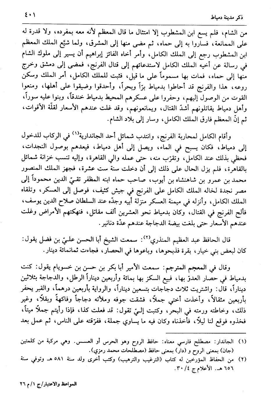من الشام، فلم يسع ابن المشطوب إلا امتثال ما قال المعظم لأنه معه بمفرده، ولا قدرة له على الممانعة، فساروا به إلى حماه، ثم مضى منها إلى المشرق، ولما شيّع الملك المعظم ابن المشطوب رجع إلى الملك الكامل، وأمر أخاه الفائز إبراهيم أن يسير إلى ملوك الشام في رسالة عن أخيه الملك الكامل لاستدعائهم إلى قتال الفرنج، فمضى إلى دمشق وخرج منها إلى حماه، فمات بها مسموما على ما قيل، فثبت للملك الكامل، أمر الملك وسكن روعه، هذا والفرنج قد أحاطوا بدمياط برّا وبحرا، وأحدقوا وضيقوا على أهلها، ومنعوا القوت من الوصول إليهم، وحفروا على عسكرهم المحيط بدمياط خندقا، وبنوا عليه سورا، وأهل دمياط يقاتلونهم أشدّ القتال، ويمانعونهم، وقد غلت عندهم الأسعار لقلّة الأقوات، ثم إنّ المعظم فارق الملك الكامل، وسار إلى بلاد الشام.