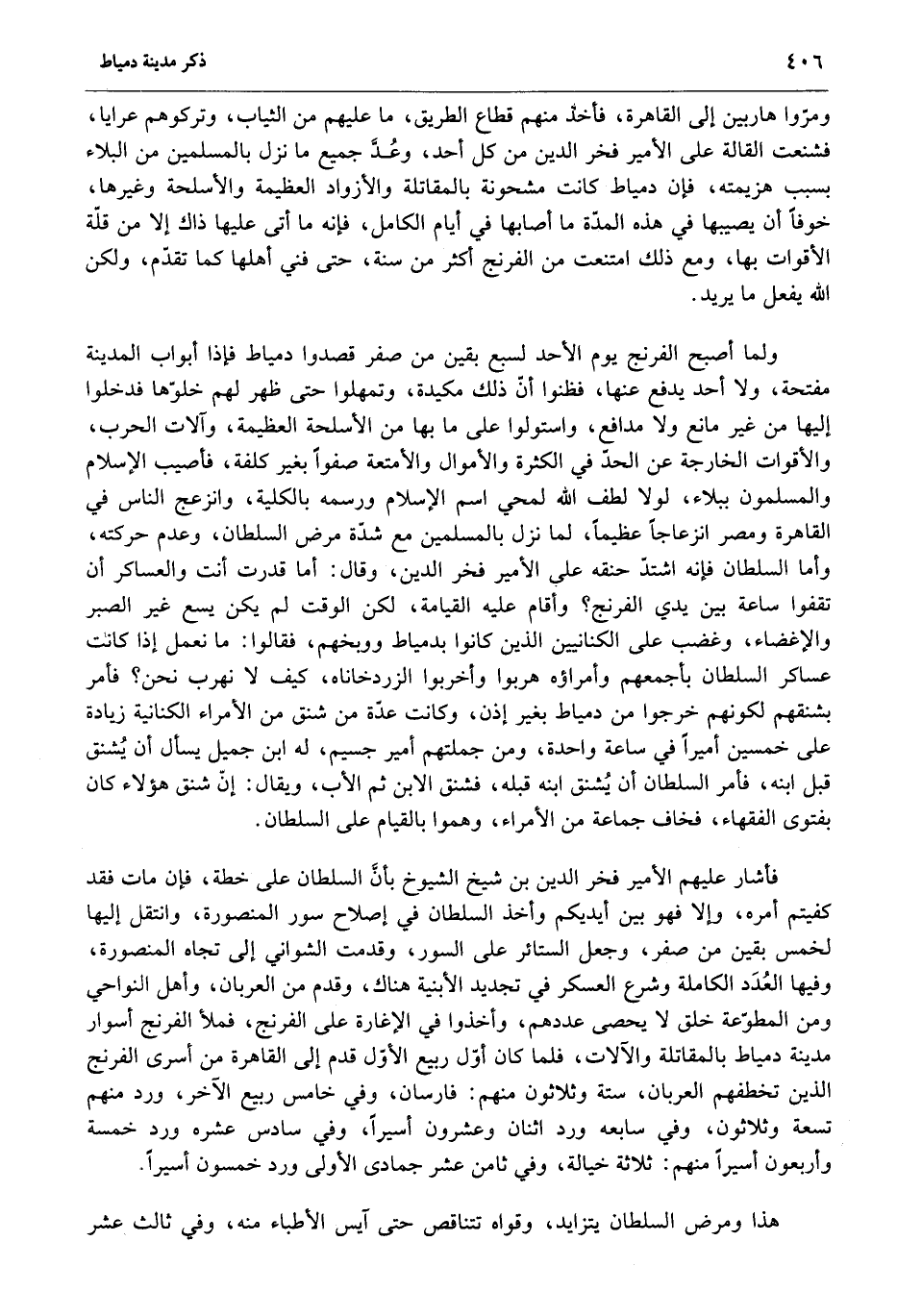 فأشار عليهم الأمير فخر الدين بن شيخ الشيوخ بأنّ السلطان على خطة، فإن مات فقد كفيتم أمره، وإلا فهو بين أيديكم وأخذ السلطان في إصلاح سور المنصورة، وانتقل إليها لخمس بقين من صفر، وجعل الستائر على السور، وقدمت الشواني إلى تجاه المنصورة، وفيها العدد الكاملة وشرع العسكر في تجديد الأبنية هناك، وقدم من العربان، وأهل النواحي ومن المطوّعة خلق لا يحصى عددهم، وأخذوا في الإغارة على الفرنج، فملأ الفرنج أسوار مدينة دمياط بالمقاتلة والآلات، فلما كان أوّل ربيع الأوّل قدم إلى القاهرة من أسرى الفرنج الذين تخطفهم العربان، ستة وثلاثون منهم: فارسان، وفي خامس ربيع الآخر، ورد منهم تسعة وثلاثون، وفي سابعه ورد اثنان وعشرون أسيرا، وفي سادس عشره ورد خمسة وأربعون أسيرا منهم: ثلاثة خيالة، وفي ثامن عشر جمادى الأولى ورد خمسون أسيرا.