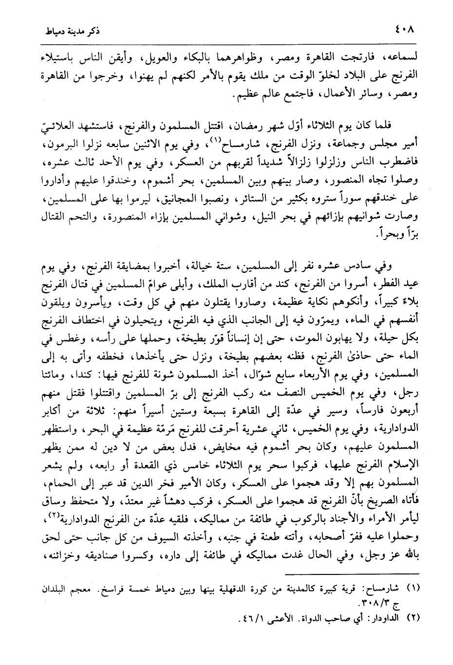 وفي سادس عشره نفر إلى المسلمين، ستة خيالة، أخبروا بمضايقة الفرنج، وفي يوم عيد الفطر، أسروا من الفرنج، كند من أقارب الملك، وأبلى عوامّ المسلمين في قتال الفرنج بلاء كبيرا، وأنكوهم نكاية عظيمة، وصاروا يقتلون منهم في كل وقت، ويأسرون ويلقون أنفسهم في الماء، ويمرّون فيه إلى الجانب الذي فيه الفرنج، ويتحيلون في اختطاف الفرنج بكل حيلة، ولا يهابون الموت، حتى إن إنسانا قوّر بطيخة، وحملها على رأسه، وغطس في الماء حتى حاذى الفرنج، فظنه بعضهم بطيخة، ونزل حتى يأخذها، فخطفه وأتى به إلى المسلمين، وفي يوم الأربعاء سابع شوّال، أخذ المسلمون شونة للفرنج فيها: كندا، ومائتا رجل، وفي يوم الخميس النصف منه ركب الفرنج إلى برّ المسلمين واقتتلوا فقتل منهم أربعون فارسا، وسير في عدّة إلى القاهرة بسبعة وستين أسيرا منهم: ثلاثة من أكابر الدوادارية، وفي يوم الخميس، ثاني عشرية أحرقت للفرنج مرمّة عظيمة في البحر، واستظهر المسلمون عليهم، وكان بحر أشموم فيه مخايض، فدل بعض من لا دين له ممن يظهر الإسلام الفرنج عليها، فركبوا سحر يوم الثلاثاء خامس ذي القعدة أو رابعه، ولم يشعر المسلمون بهم إلا وقد هجموا على العسكر، وكان الأمير فخر الدين قد عبر إلى الحمام، فأتاه الصريخ بأنّ الفرنج قد هجموا على العسكر، فركب دهشا غير معتدّ، ولا متحفظ وساق ليأمر الأمراء والأجناد بالركوب في طائفة من مماليكه، فلقيه عدّة من الفرنج الدوادارية «2» ، وحملوا عليه ففرّ أصحابه، وأتته طعنة في جنبه، وأخذته السيوف من كل جانب حتى لحق بالله عز وجل، وفي الحال غدت مماليكه في طائفة إلى داره، وكسروا صناديقه وخزائنه،