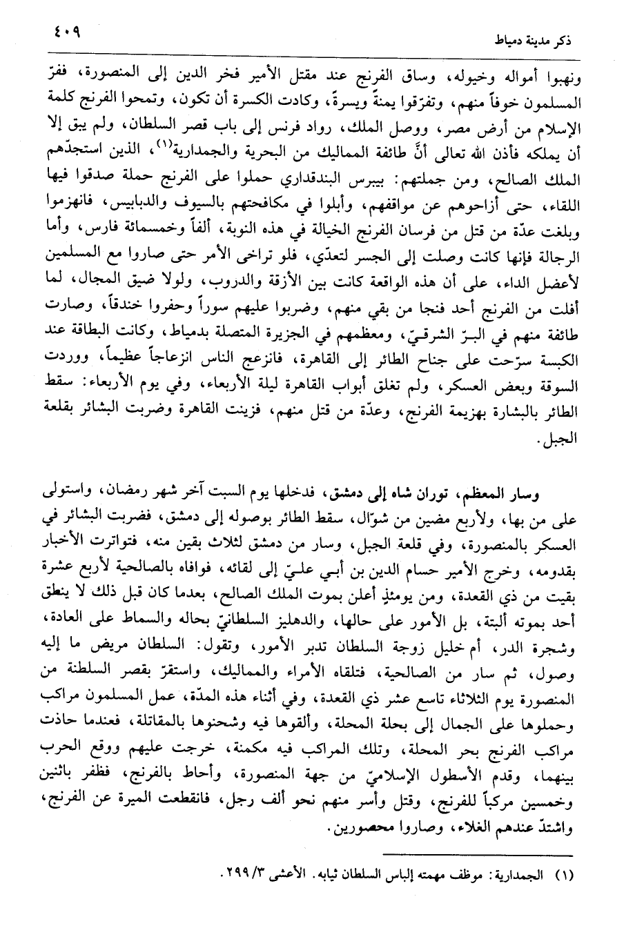 ونهبوا أمواله وخيوله، وساق الفرنج عند مقتل الأمير فخر الدين إلى المنصورة، ففرّ المسلمون خوفا منهم، وتفرّقوا يمنة ويسرة، وكادت الكسرة أن تكون، وتمحوا الفرنج كلمة الإسلام من أرض مصر، ووصل الملك، رواد فرنس إلى باب قصر السلطان، ولم يبق إلا أن يملكه فأذن الله تعالى أنّ طائفة المماليك من البحرية والجمدارية «1» ، الذين استجدّهم الملك الصالح، ومن جملتهم: بيبرس البندقداري حملوا على الفرنج حملة صدقوا فيها اللقاء، حتى أزاحوهم عن مواقفهم، وأبلوا في مكافحتهم بالسيوف والدبابيس، فانهزموا وبلغت عدّة من قتل من فرسان الفرنج الخيالة في هذه النوبة، ألفا وخمسمائة فارس، وأما الرجالة فإنها كانت وصلت إلى الجسر لتعدّي، فلو تراخى الأمر حتى صاروا مع المسلمين لأعضل الداء، على أن هذه الواقعة كانت بين الأزقة والدروب، ولولا ضيق المجال، لما أفلت من الفرنج أحد فنجا من بقي منهم، وضربوا عليهم سورا وحفروا خندقا، وصارت طائفة منهم في البرّ الشرقيّ، ومعظمهم في الجزيرة المتصلة بدمياط، وكانت البطاقة عند الكبسة سرّحت على جناح الطائر إلى القاهرة، فانزعج الناس انزعاجا عظيما، ووردت السوقة وبعض العسكر، ولم تغلق أبواب القاهرة ليلة الأربعاء، وفي يوم الأربعاء: سقط الطائر بالبشارة بهزيمة الفرنج، وعدّة من قتل منهم، فزينت القاهرة وضربت البشائر بقلعة الجبل.