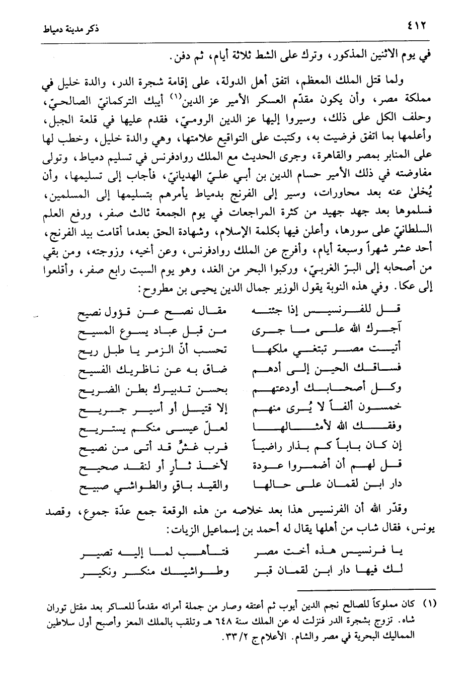 ولما قتل الملك المعظم، اتفق أهل الدولة، على إقامة شجرة الدر، والدة خليل في مملكة مصر، وأن يكون مقدّم العسكر الأمير عز الدين «1» أيبك التركمانيّ الصالحيّ، وحلف الكل على ذلك، وسيروا إليها عز الدين الروميّ، فقدم عليها في قلعة الجبل، وأعلمها بما اتفق فرضيت به، وكتبت على التواقيع علامتها، وهي والدة خليل، وخطب لها على المنابر بمصر والقاهرة، وجرى الحديث مع الملك روادفرنس في تسليم دمياط، وتولى مفاوضته في ذلك الأمير حسام الدين بن أبي عليّ الهديانيّ، فأجاب إلى تسليمها، وأن يخلى عنه بعد محاورات، وسير إلى الفرنج بدمياط يأمرهم بتسليمها إلى المسلمين، فسلموها بعد جهد جهيد من كثرة المراجعات في يوم الجمعة ثالث صفر، ورفع العلم السلطانيّ على سورها، وأعلن فيها بكلمة الإسلام، وشهادة الحق بعد ما أقامت بيد الفرنج، أحد عشر شهرا وسبعة أيام، وأفرج عن الملك روادفرنس، وعن أخيه، وزوجته، ومن بقي من أصحابه إلى البرّ الغربيّ، وركبوا البحر من الغد، وهو يوم السبت رابع صفر، وأقلعوا إلى عكا. وفي هذه النوبة يقول الوزير جمال الدين يحيى بن مطروح: