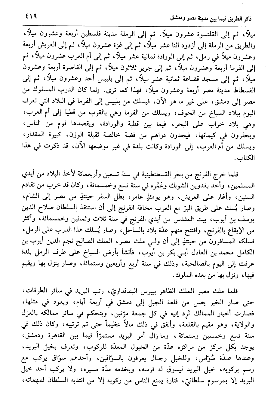 ميلا، ثم إلى القلنسوة عشرون ميلا، ثم إلى الرملة مدينة فلسطين أربعة وعشرون ميلا، والطريق من الرملة إلى أزدود اثنا عشر ميلا، ثم إلى غزة عشرون ميلا، ثم إلى العريش أربعة وعشرون ميلا في رمل، ثم إلى الورادة ثمانية عشر ميلا، ثم إلى أم العرب عشرون ميلا، ثم إلى الفرما أربعة وعشرون ميلا، ثم إلى جرير ثلاثون ميلا، ثم إلى القاصرة أربعة وعشرون ميلا، ثم إلى مسجد قضاعة ثمانية عشر ميلا، ثم إلى بلبيس أحد وعشرون ميلا، ثم إلى الفسطاط مدينة مصر أربعة وعشرون ميلا، فهذا كما ترى. إنما كان الدرب المسلوك من مصر إلى دمشق، على غير ما هو الآن، فيسلك من بلبيس إلى الفرما في البلاد التي تعرف اليوم ببلاد السباخ من الحوف، ويسلك من الفرما وهي بالقرب من قطية إلى أم العرب، وهي بلاد خراب على البحر، فيما بين قطية والورادة، ويقصدها قوم من الناس، ويحفرون في كيمانها، فيجدون دراهم من فضة خالصة ثقيلة الوزن، كبيرة المقدار، ويسلك من أم العرب، إلى الورادة وكانت بلدة في غير موضعها الآن، قد ذكرت في هذا الكتاب.