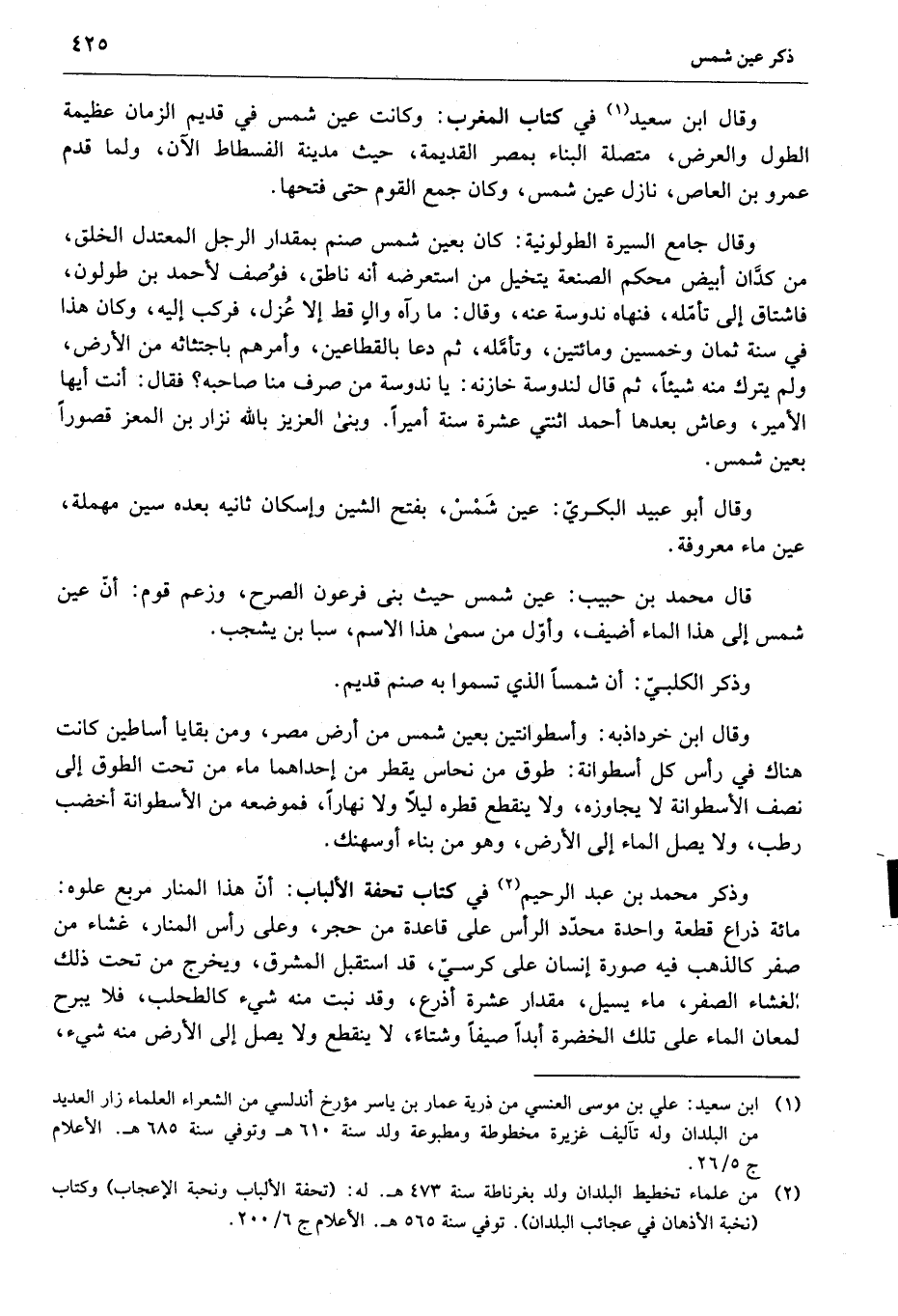 وقال ابن سعيد «1» في كتاب المغرب: وكانت عين شمس في قديم الزمان عظيمة الطول والعرض، متصلة البناء بمصر القديمة، حيث مدينة الفسطاط الآن، ولما قدم عمرو بن العاص، نازل عين شمس، وكان جمع القوم حتى فتحها.
