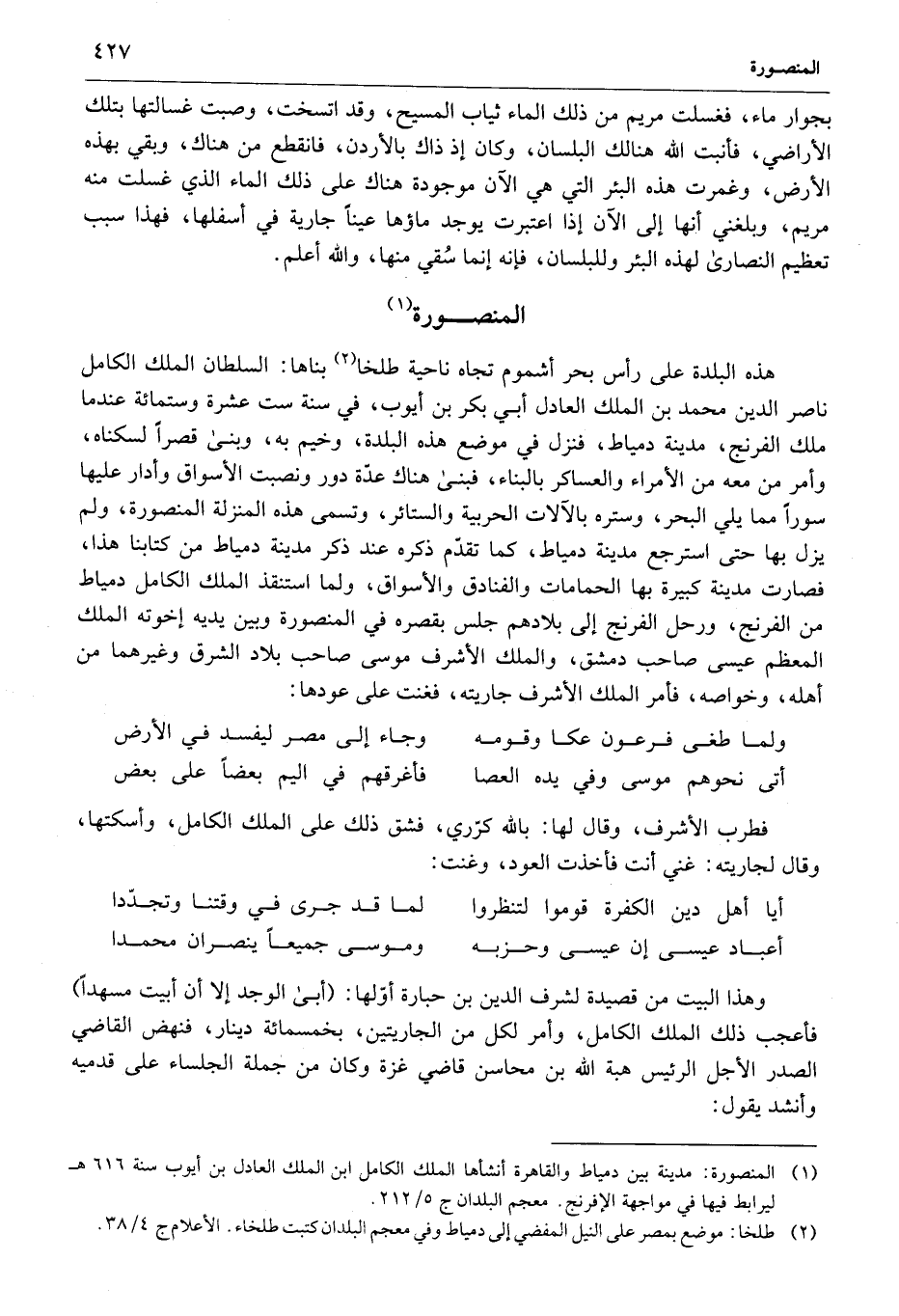 هذه البلدة على رأس بحر أشموم تجاه ناحية طلخا «2» بناها: السلطان الملك الكامل ناصر الدين محمد بن الملك العادل أبي بكر بن أيوب، في سنة ست عشرة وستمائة عند ما ملك الفرنج، مدينة دمياط، فنزل في موضع هذه البلدة، وخيم به، وبنى قصرا لسكناه، وأمر من معه من الأمراء والعساكر بالبناء، فبنى هناك عدّة دور ونصبت الأسواق وأدار عليها سورا مما يلي البحر، وستره بالآلات الحربية والستائر، وتسمى هذه المنزلة المنصورة، ولم يزل بها حتى استرجع مدينة دمياط، كما تقدّم ذكره عند ذكر مدينة دمياط من كتابنا هذا، فصارت مدينة كبيرة بها الحمامات والفنادق والأسواق، ولما استنقذ الملك الكامل دمياط من الفرنج، ورحل الفرنج إلى بلادهم جلس بقصره في المنصورة وبين يديه إخوته الملك المعظم عيسى صاحب دمشق، والملك الأشرف موسى صاحب بلاد الشرق وغيرهما من أهله، وخواصه، فأمر الملك الأشرف جاريته، فغنت على عودها: